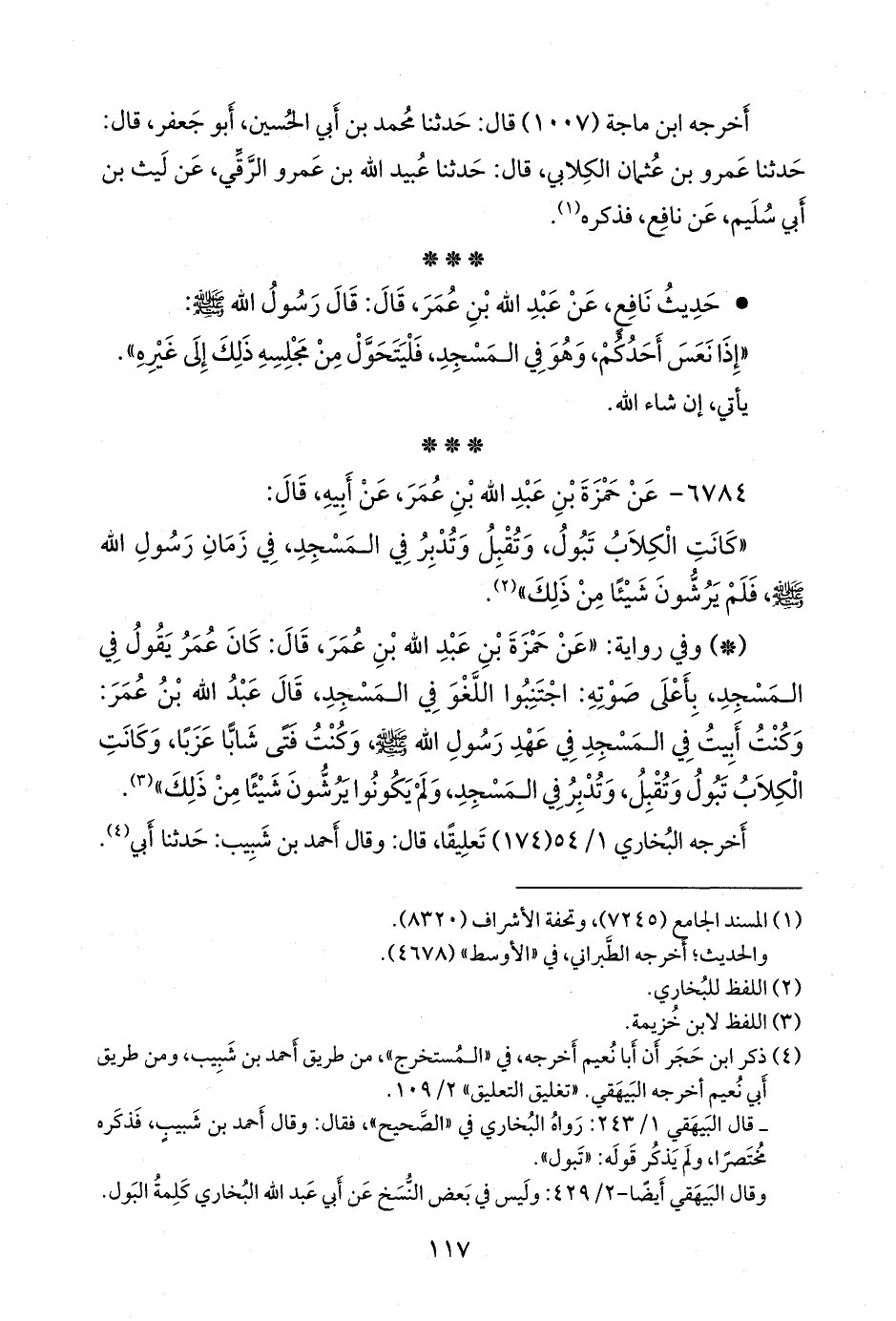 - وفي رواية: «عن حمزة بن عبد الله بن عمر، قال: كان عمر يقول في المسجد، بأعلى صوته: اجتنبوا اللغو في المسجد، قال عبد الله بن عمر: وكنت أبيت في المسجد في عهد رسول الله صَلى الله عَليه وسَلم وكنت فتى شابا عزبا، وكانت الكلاب تبول وتقبل، وتدبر في المسجد، ولم يكونوا يرشون شيئًا من ذلك» (¬٢).
