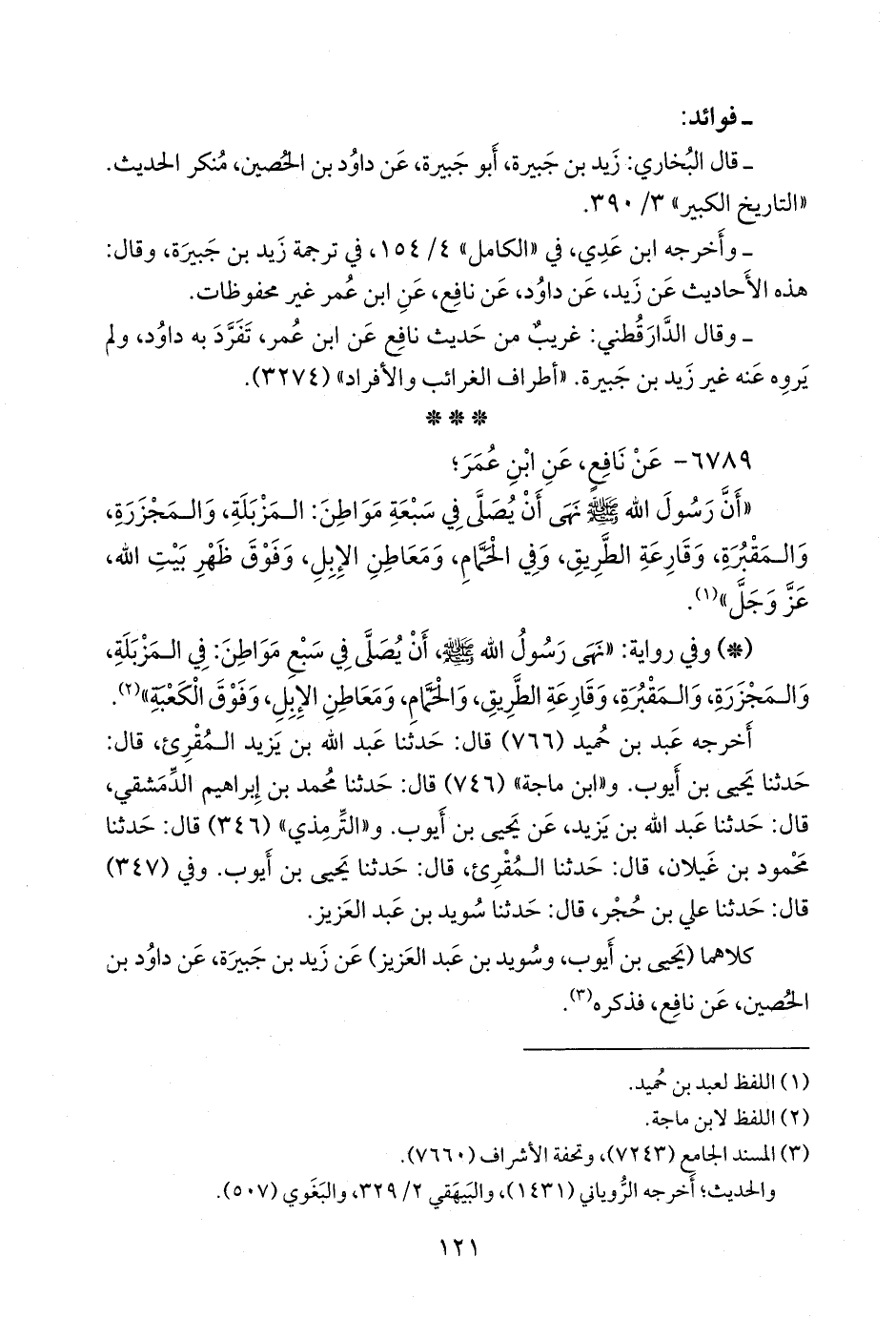 - وقال الدارقُطني: غريبٌ من حديث نافع عن ابن عمر، تفرد به داود، ولم يروه عنه غير زيد بن جَبيرَة. «أطراف الغرائب والأفراد» (٣٢٧٤).