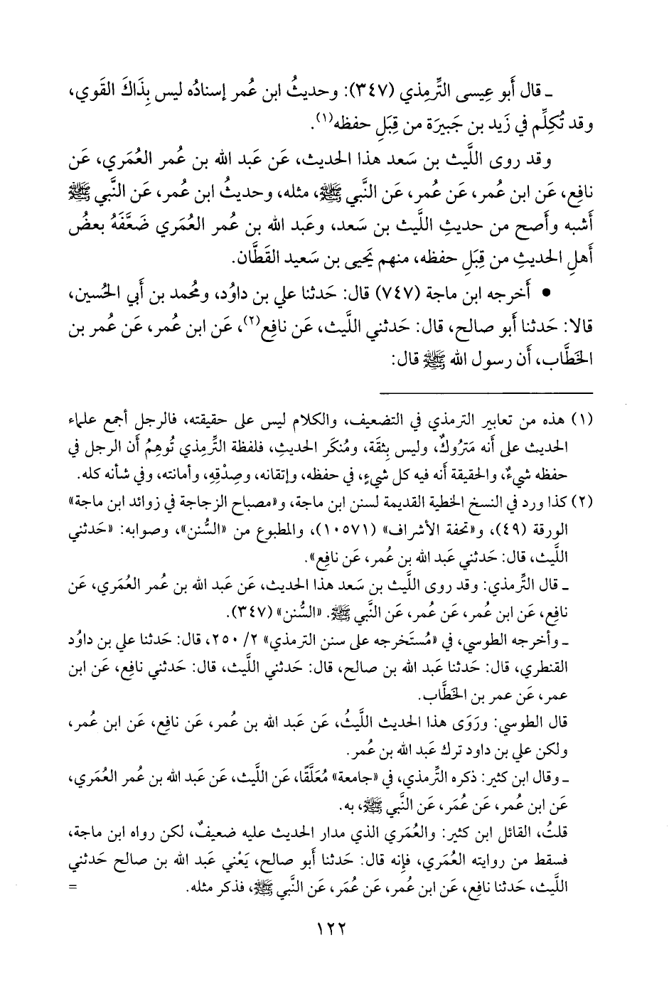 (¬١) كذا ورد في النسخ الخطية القديمة لسنن ابن ماجة، و «مصباح الزجاجة» الورقة (٤٩)، و «تحفة الأشراف» (١٠٥٧١)، والمطبوع من «السنن»، قال التِّرمِذي: وقد روى الليث بن سعد هذا الحديث، عن عبد الله بن عمر العُمَري، عن نافع، عن ابن عمر، عن عمر، عن النبي صَلى الله عَليه وسَلم. «السنن» (٣٤٧). وقال ابن كثير: رواه ابن ماجة، فسقط من روايته العُمَري، لكن لا بد من ذكر العُمَري فيه، وسقط إما من حفظ ابن ماجة، أو أحد شيخيه، والله أَعلم بالصواب. «مسند الفاروق» ١/ ٢٠٣.