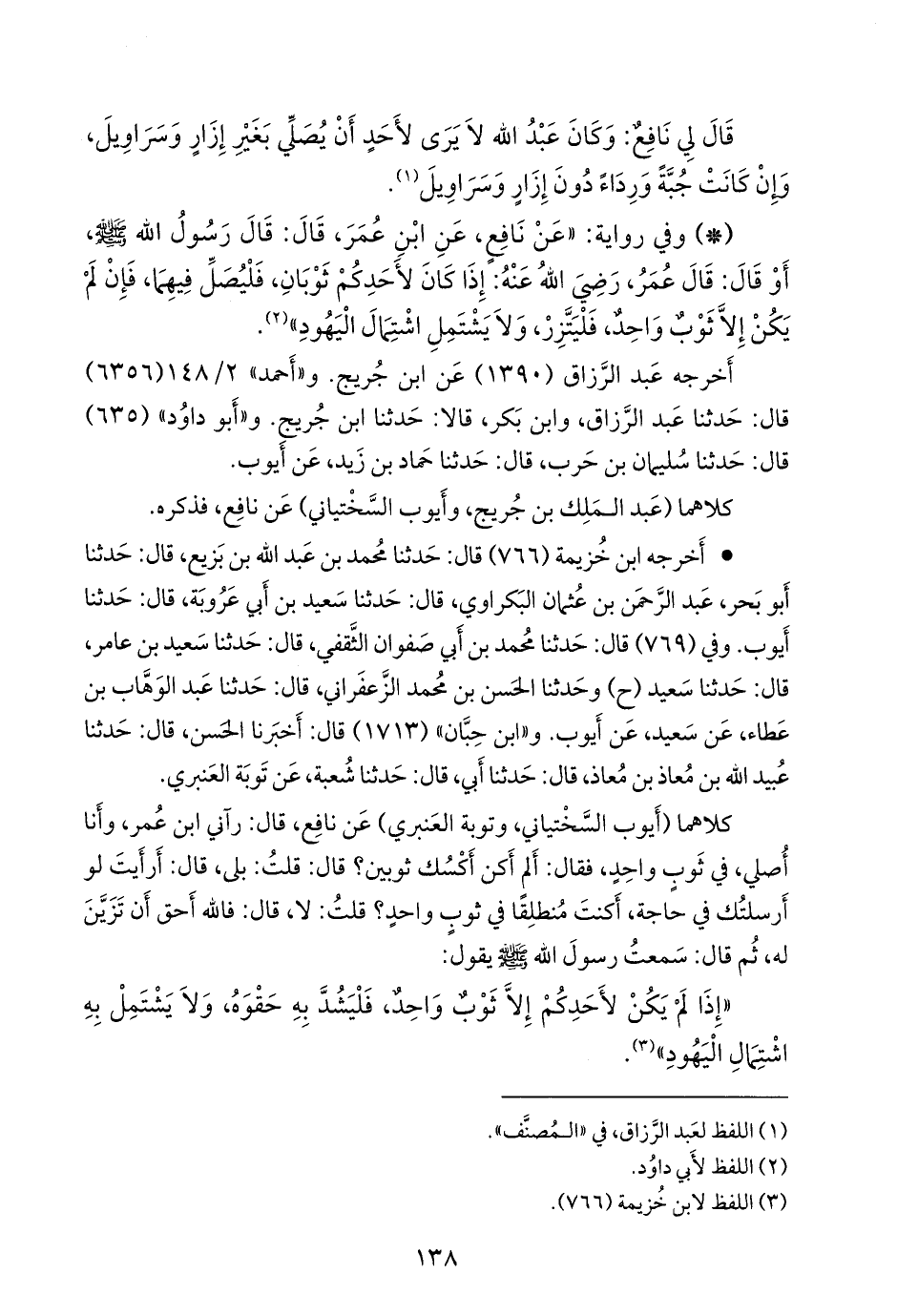 كلاهما (أيوب السَّخْتِياني، وتوبة العنبري) عن نافع، قال: رآني ابن عمر، وأنا أصلي في ثوب واحد، فقال: ألم أكن أكسك ثوبين؟ قال: قلت: بلى، قال: أرأيت لو أرسلتك في حاجة، أكنت منطلقا في ثوب واحد؟ قلت: لا، قال: فالله أحق أن تزين له، ثم قال: سمعت رسول الله صَلى الله عَليه وسَلم يقول: