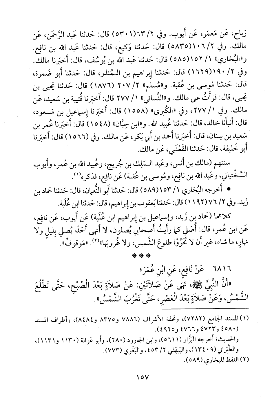 ستتهم (مالك بن أنس، وعبد الملك بن جُريج، وعُبيد الله بن عمر، وأيوب السَّخْتِياني، وعبد الله بن نافع، وموسى بن عُقبة) عن نافع، فذكره (¬١).