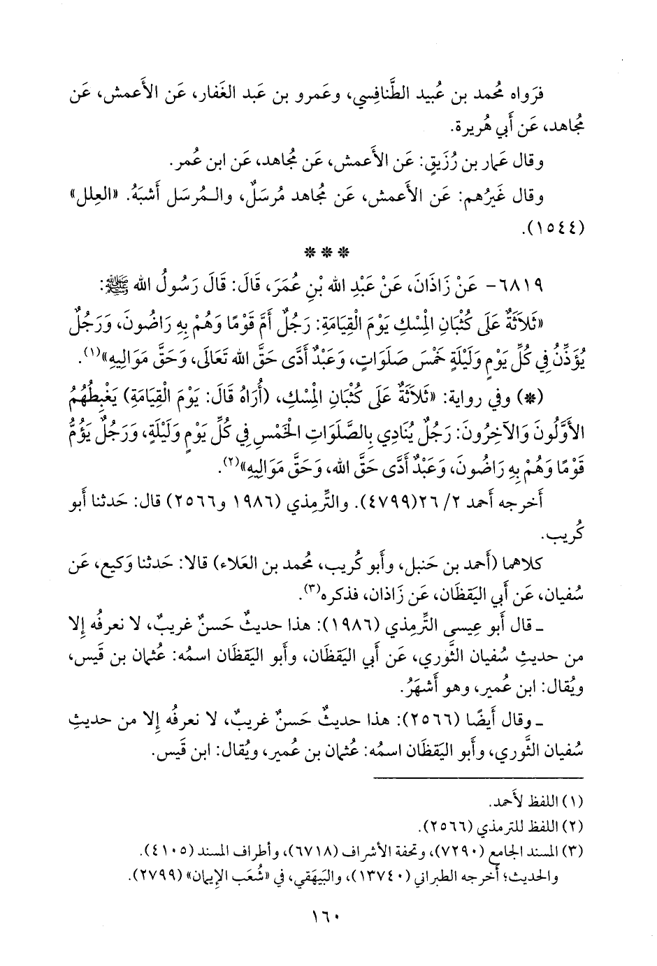 - وفي رواية: «ثلاثة على كثبان المسك، (أراه قال: يوم القيامة) يغبطهم الأولون والآخرون: رجل ينادي بالصلوات الخمس في كل يوم وليلة، ورجل يؤم قوما وهم به راضون، وعبد أدى حق الله، وحق مواليه» (¬٢).