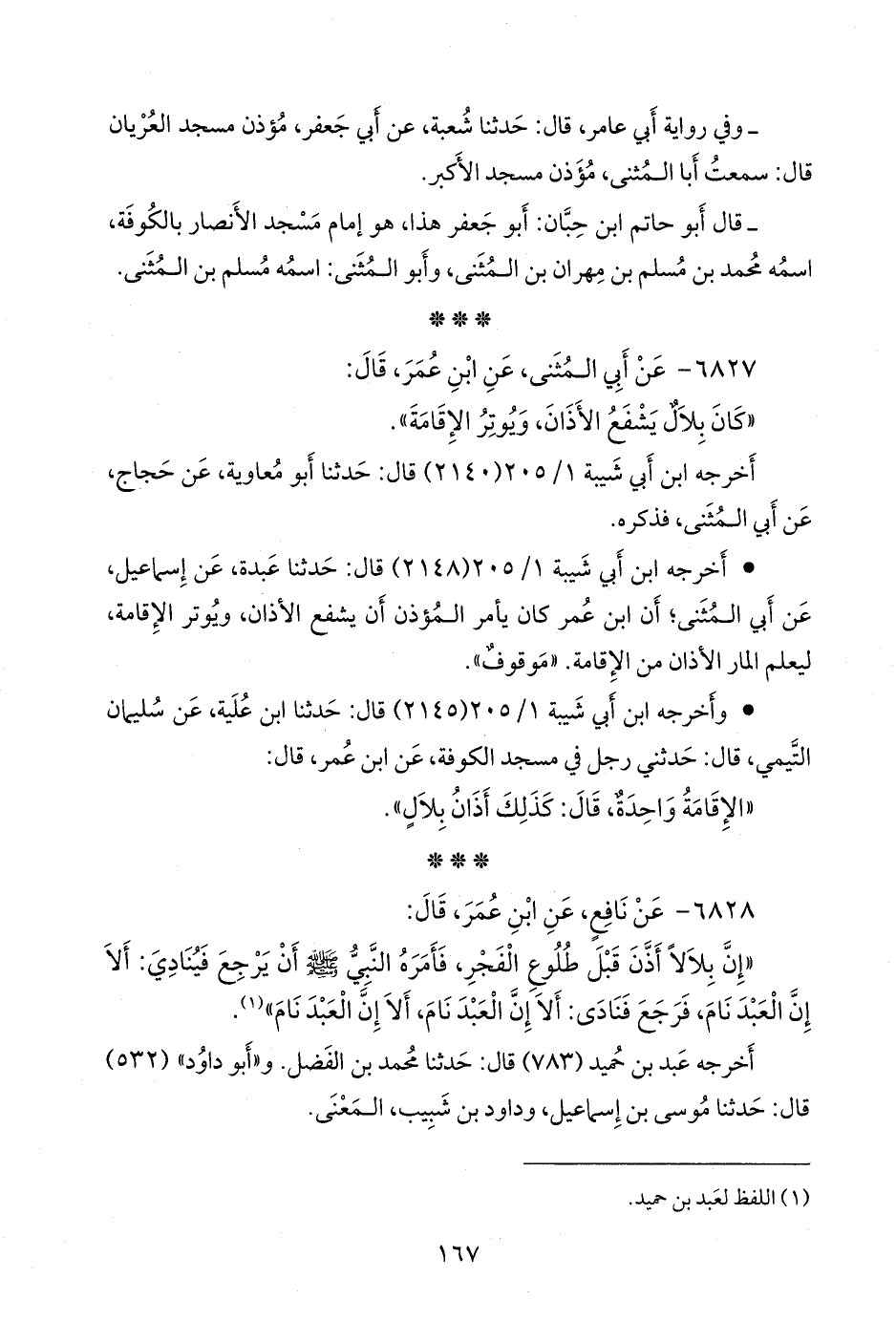 - وقال التِّرمِذي، عقب (٢٠٣): وروى حماد بن سلمة، عن أيوب، عن نافع، عن ابن عمر؛ أن بلالا أذن بليل، فأمره النبي صَلى الله عَليه وسَلم أن ينادي: إن العبد نام.