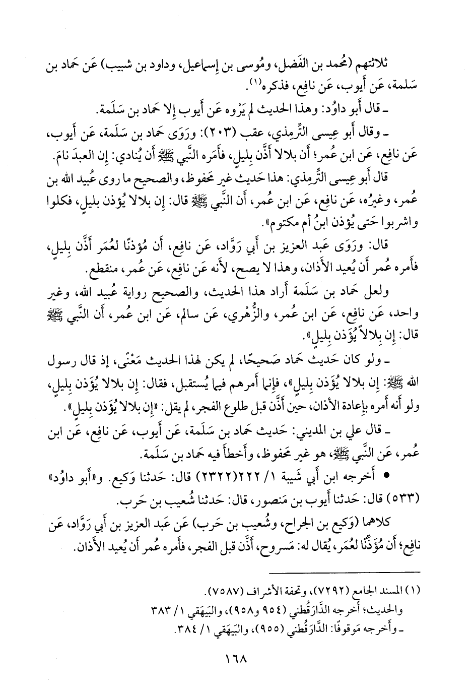 ولعل حماد بن سلمة أراد هذا الحديث، والصحيح رواية عُبيد الله، وغير واحد، عن نافع، عن ابن عمر، والزُّهْري، عن سالم، عن ابن عمر، أن النبي صَلى الله عَليه وسَلم قال: إن بلالا يؤذن بليل».