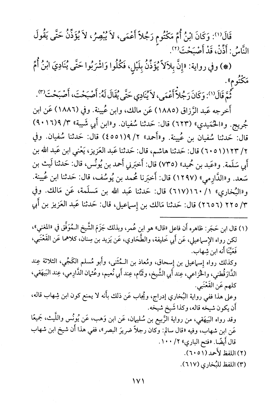 - وفي رواية: «إن بلالا يؤذن بليل، فكلوا واشربوا حتى ينادي ابن أم مكتوم».