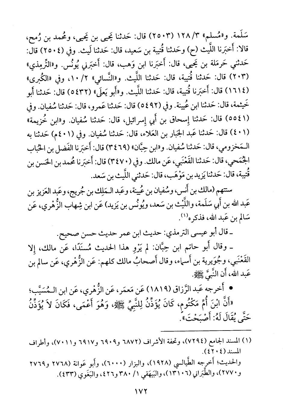 - وقال أَبو حاتم بن حبان: لم يرو هذا الحديث مسندا، عن مالك، إلا القَعنَبي، وجويرية بن أسماء، وقال أصحاب مالك كلهم: عن الزُّهْري، عن سالم بن عبد الله، أن النبي صَلى الله عَليه وسَلم.