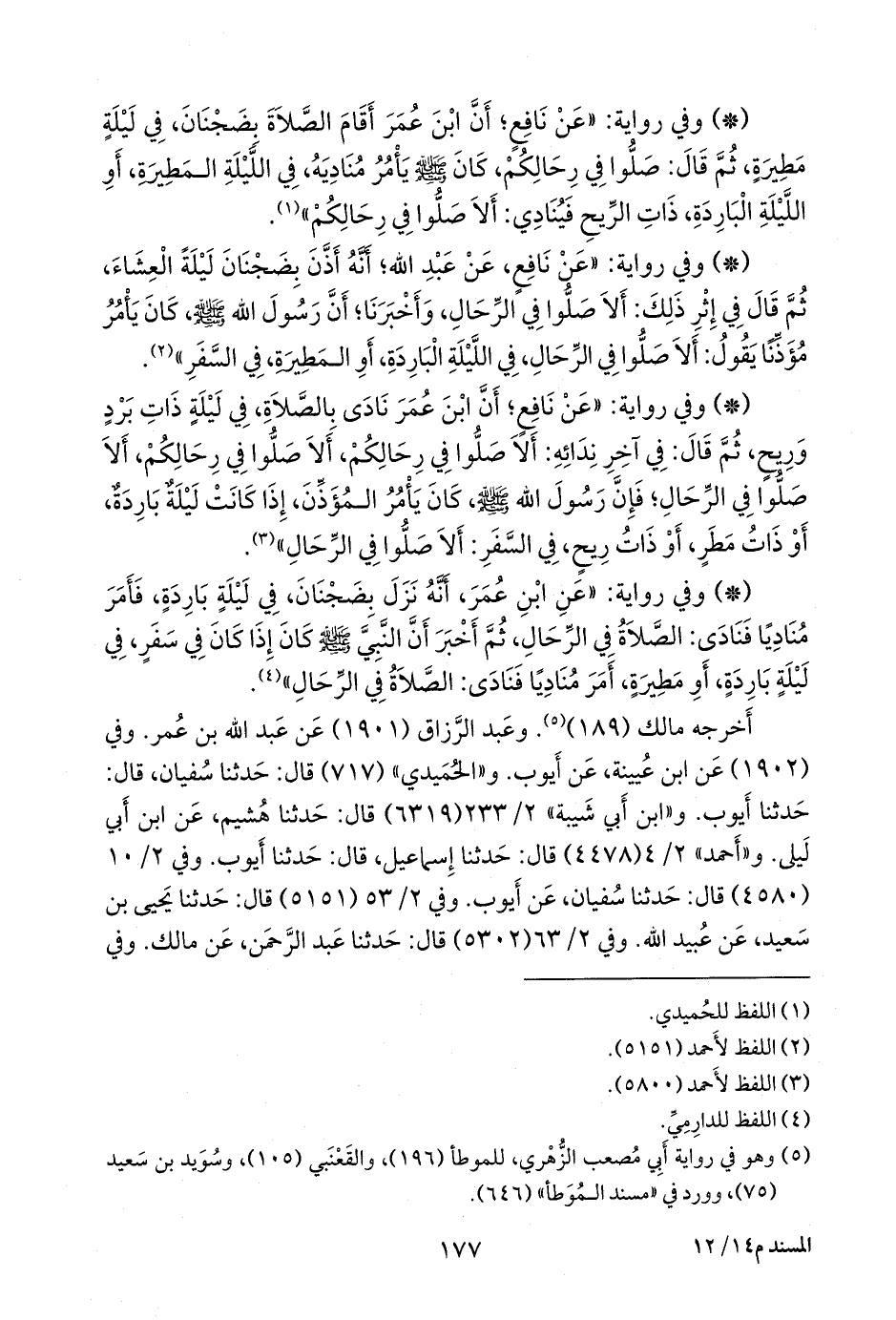 - وفي رواية: «عن نافع؛ أن ابن عمر نادى بالصلاة، في ليلة ذات برد وريح، ثم قال: في آخر ندائه: ألا صلوا في رحالكم، ألا صلوا في رحالكم، ألا صلوا في الرحال؛ فإن رسول الله صَلى الله عَليه وسَلم كان يأمر المؤذن، إذا كانت ليلة باردة، أو ذات مطر، أو ذات ريح، في السفر: ألا صلوا في الرحال» (¬١).