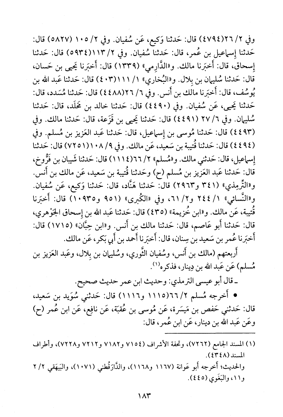 وفي ٢/ ١١٣ (٥٩٣٤) قال: حدثنا إسحاق، قال: أخبرنا مالك. و «الدَّارِمي» (١٣٣٩) قال: أخبرنا يحيى بن حسان، قال: حدثنا سليمان بن بلال. و «البخاري» ١/ ٨٩ (٤٠٣) قال: حدثنا عبد الله بن يوسف، قال: أخبرنا مالك بن أنس. وفي ٦/ ٢١ (٤٤٨٨) قال: حدثنا مُسدد، قال: حدثنا يحيى، عن سفيان. وفي (٤٤٩٠) قال: حدثنا خالد بن مخلد، قال: حدثنا سليمان. وفي ٦/ ٢٢ (٤٤٩١) قال: حدثنا يحيى بن قَزَعة، قال: حدثنا مالك. وفي (٤٤٩٣) قال: حدثنا موسى بن إسماعيل، قال: حدثنا عبد العزيز بن مسلم. وفي (٤٤٩٤) قال: حدثنا قتيبة بن سعيد، عن مالك. وفي ٩/ ٨٧ (٧٢٥١) قال: حدثنا إسماعيل، قال: حدثني مالك. و «مسلم» ٢/ ٦٦ (١١١٤) قال: حدثنا شَيبان بن فَرُّوخ، قال: حدثنا عبد العزيز بن مسلم (ح) وحدثنا قتيبة بن سعيد، عن مالك بن أنس. و «التِّرمِذي» (٣٤١ و ٢٩٦٣) قال: حدثنا هَنَّاد، قال: حدثنا وكيع، عن سفيان. و «النَّسَائي» ١/ ٢٤٤ و ٢/ ٦١، وفي «الكبرى» (٩٥١ و ١٠٩٣٥) قال: أخبرنا قتيبة، عن مالك. و «ابن خزيمة» (٤٣٥) قال: حدثنا عبد الله بن إسحاق الجوهري، قال: حدثنا أَبو عاصم، قال: حدثنا مالك بن أنس. و «ابن حِبَّان» (١٧١٥) قال: أخبرنا عمر بن سعيد بن سنان، قال: أخبرنا أحمد بن أَبي بكر، عن مالك.