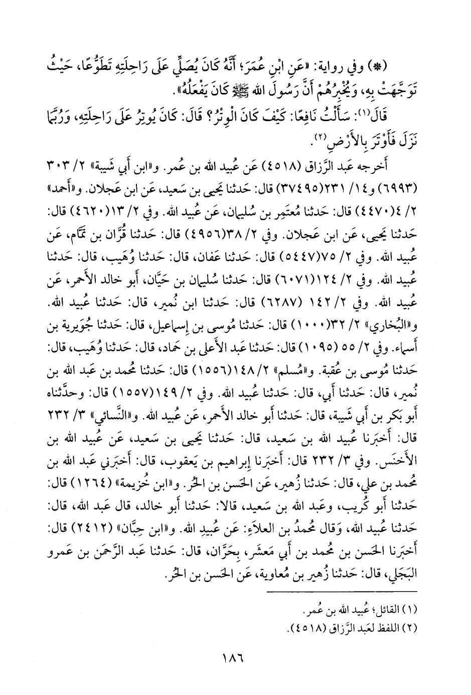 قال (¬١): سألت نافعا: كيف كان الوتر؟ قال: كان يوتر على راحلته، وربما نزل فأوتر بالأرض (¬٢).