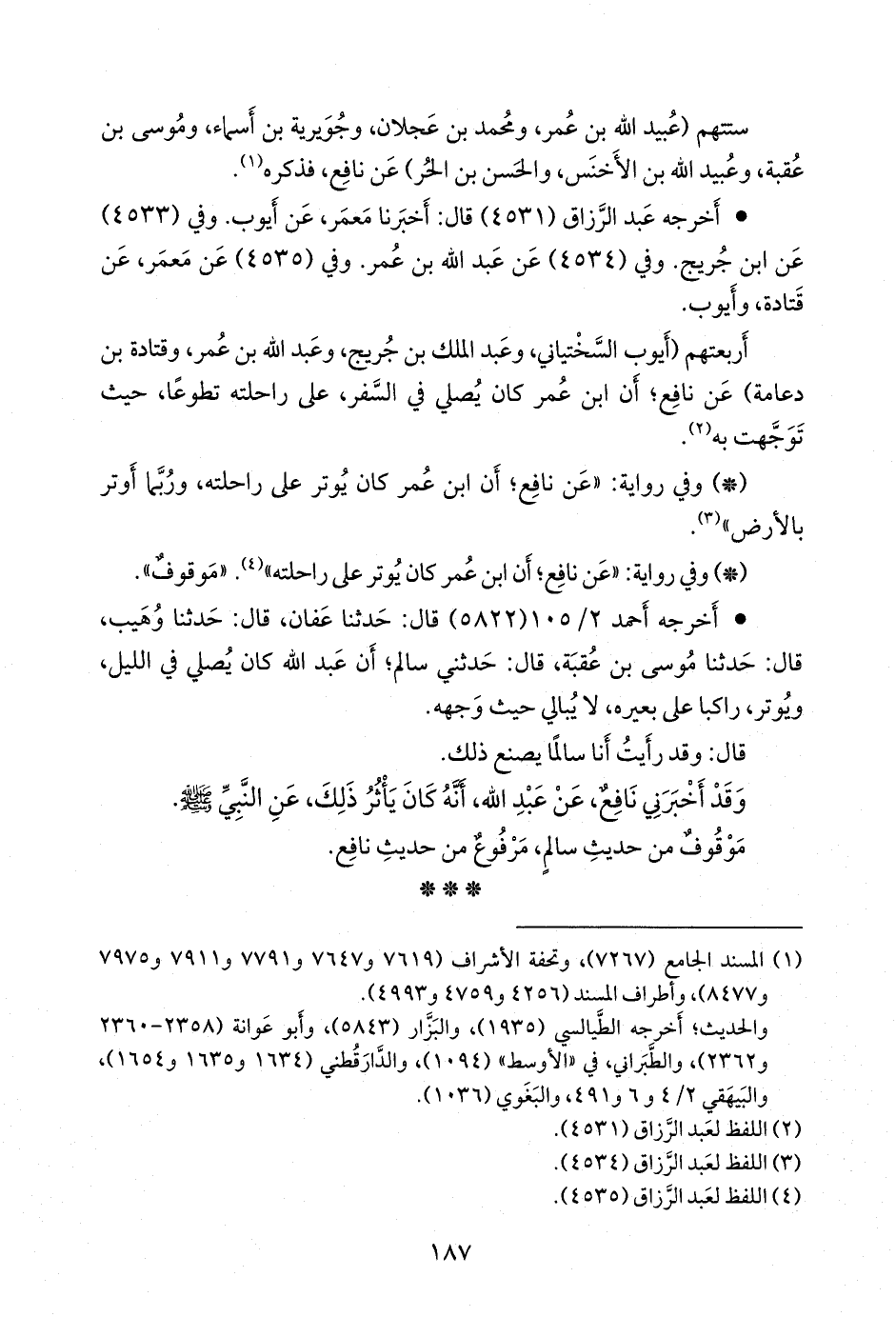 - وفي رواية: «عن نافع؛ أن ابن عمر كان يوتر على راحلته» (¬٤). «موقوف».