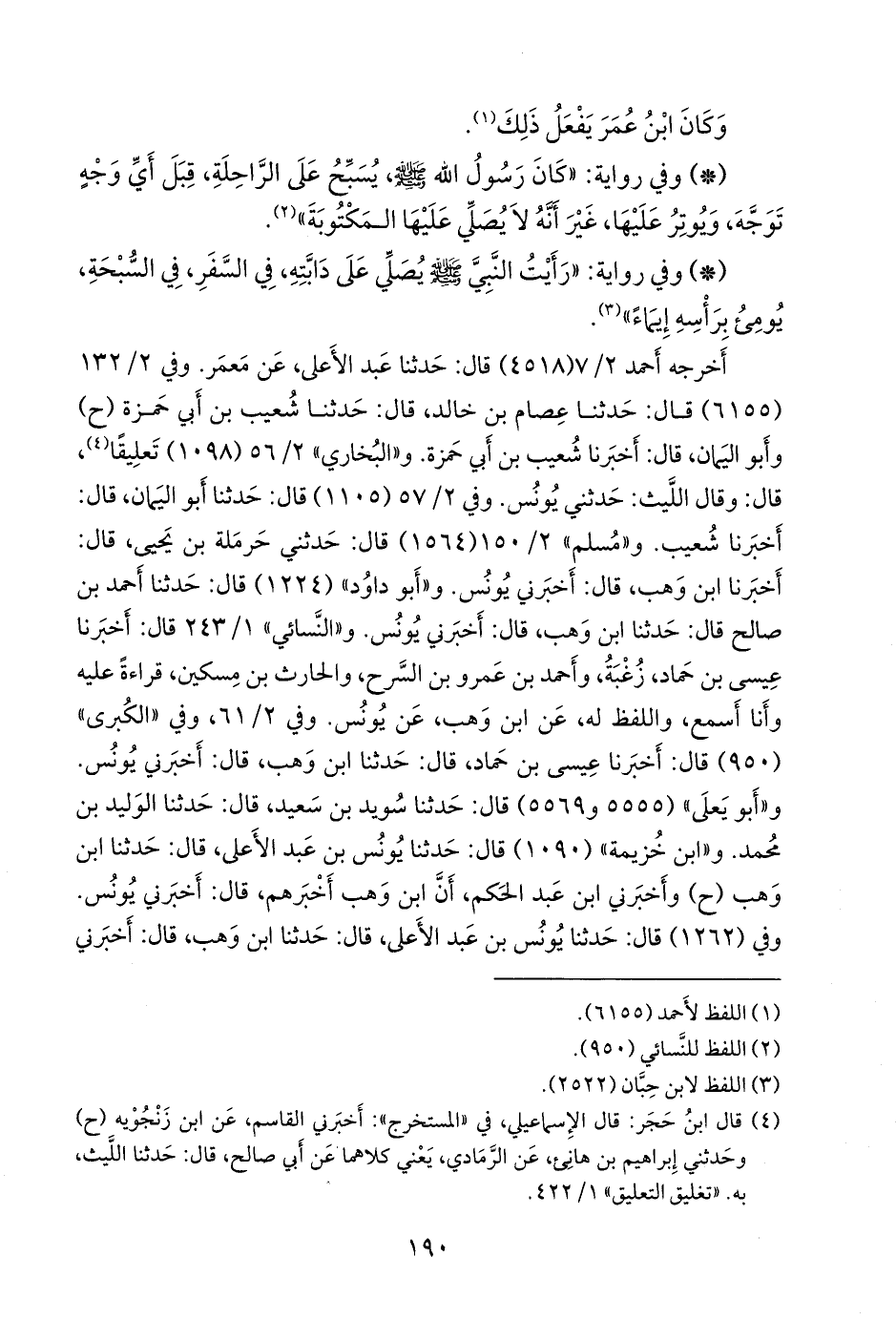 - وفي رواية ابن حبان (٢٤٢١): «قال سالم: وكان ابن عمر يصلي على دابته، من الليل، وهو يسير، لا يبالي حيث كان وجهه».