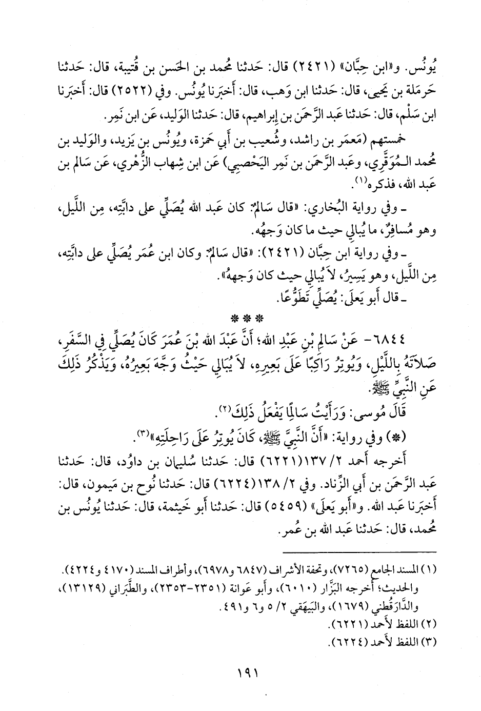 ٦٨٤٤ - عن سالم بن عبد الله؛ أن عبد الله بن عمر كان يصلي في السفر، صلاته بالليل، ويوتر راكبا على بعيره، لا يبالي حيث وجه بعيره، ويذكر ذلك عن النبي صَلى الله عَليه وسَلم.