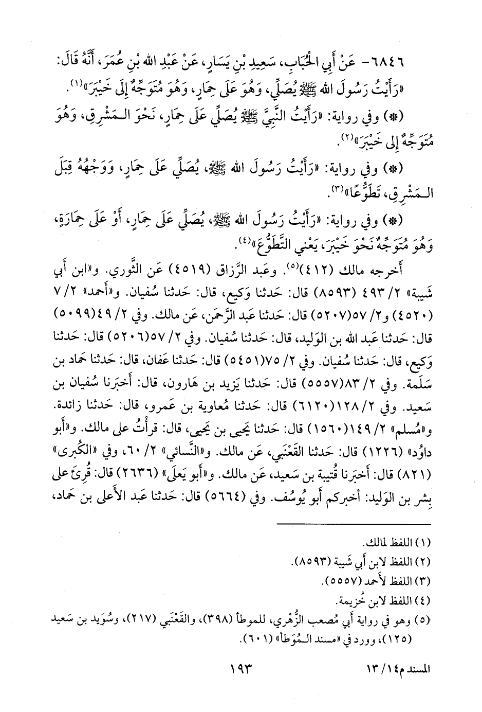 - قال أَبو عبد الرَّحمَن النَّسَائي: لم يتابع عَمرو بن يحيى على قوله: «يصلي على حمار» إنما يقولون: «يصلي على راحلته».