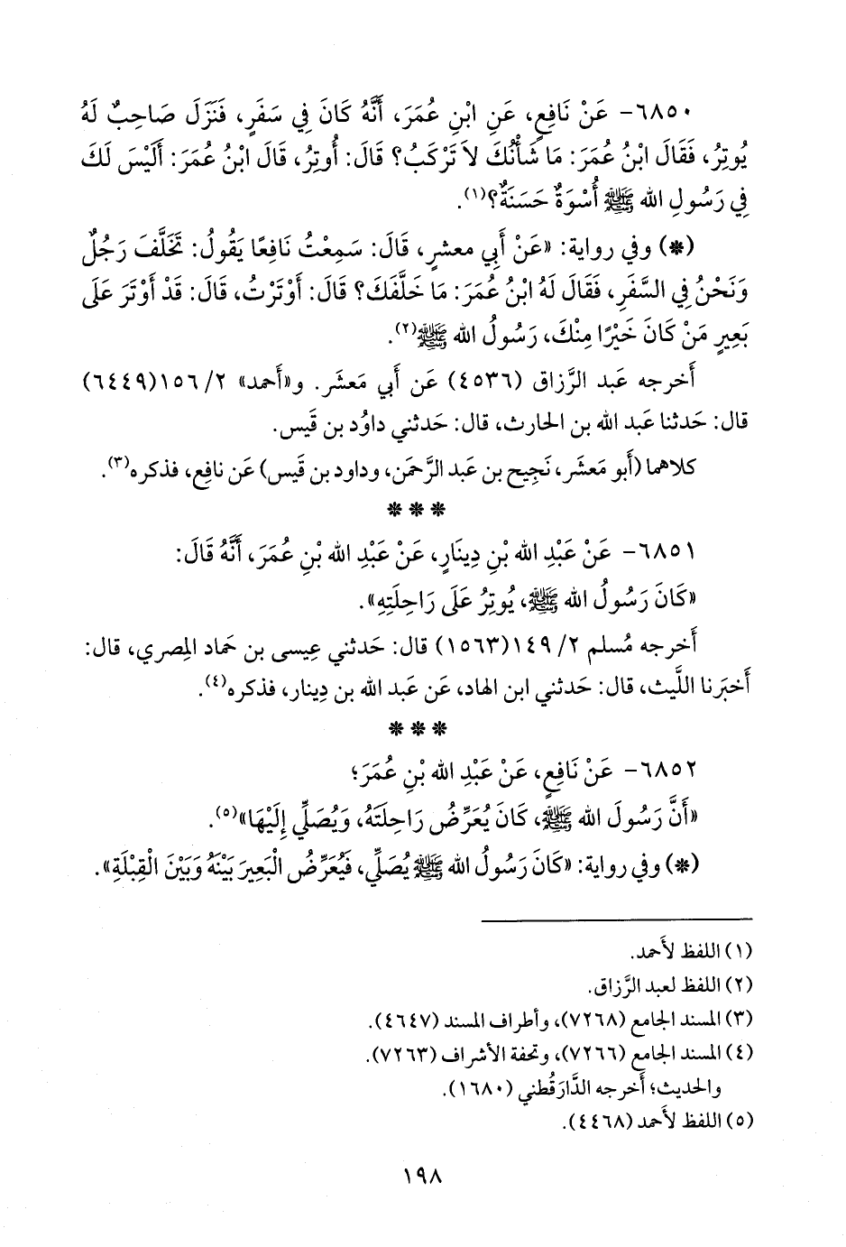 ٦٨٥٠ - عن نافع، عن ابن عمر، أنه كان في سفر، فنزل صاحب له يوتر، فقال ابن عمر: ما شأنك لا تركب؟ قال: أوتر، قال ابن عمر: أليس لك في رسول الله صَلى الله عَليه وسَلم أسوة حسنة؟ (¬١).