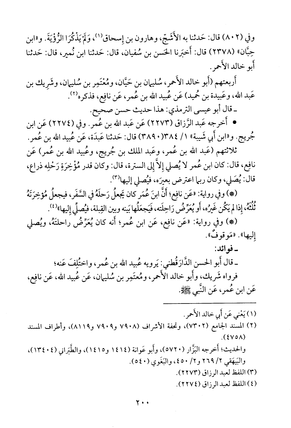 ثلاثتهم (عبد الله بن عمر، وعبد الملك بن جُريج، وعُبيد الله بن عمر) عن نافع، قال: كان ابن عمر لا يصلي إلا إلى السترة، قال: وكان قدر مؤخرة رحله ذراع، قال: يصلي، وكان ربما اعترض بعيره، فيصلي إليها (¬٢).