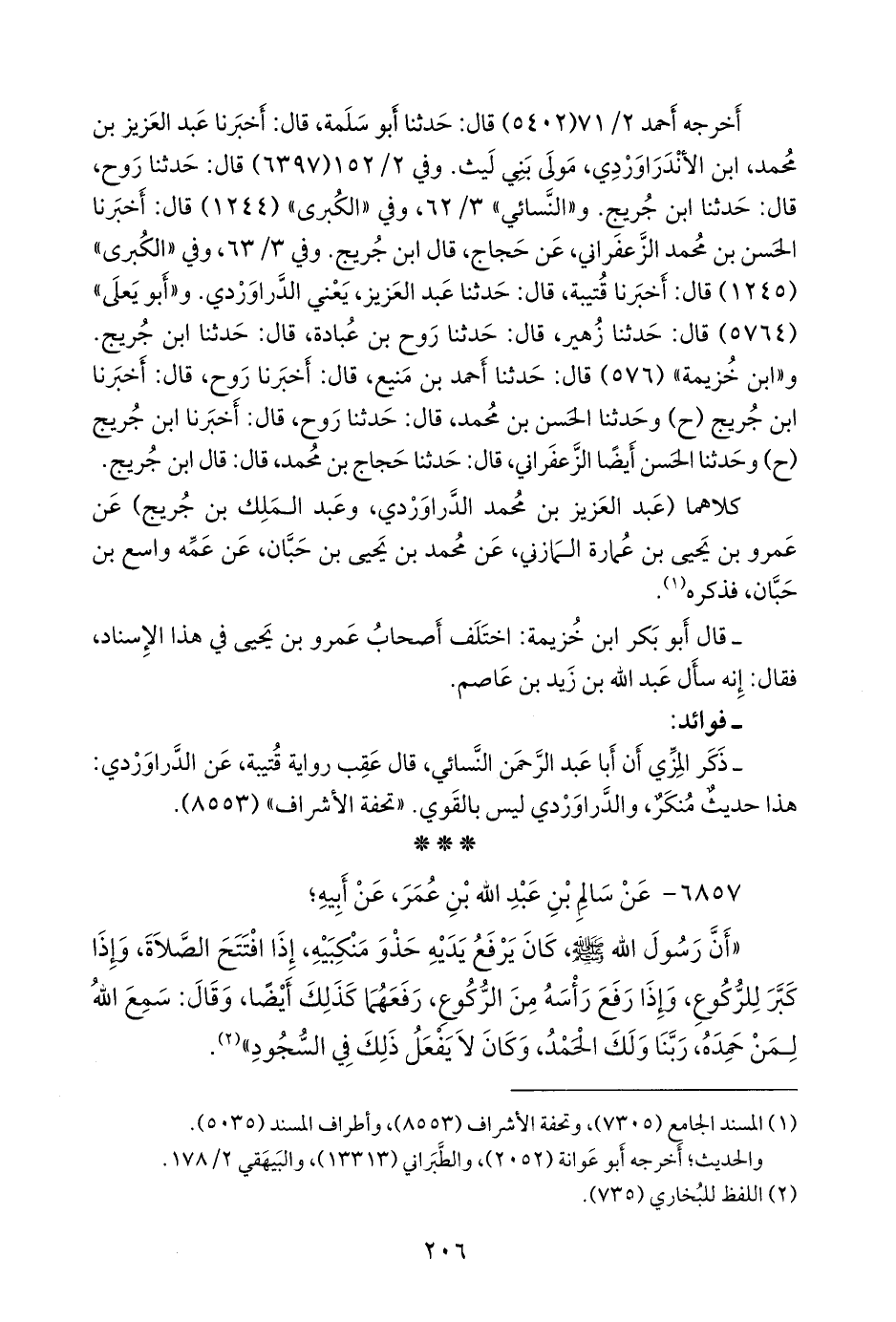 - وفي رواية: «أَن رسول الله صَلى الله عَليه وسَلم كان إِذا دخل الصلاة كبر ورفع يديه حذو منكبيه، وإِذا ركع كبر ورفع يديه، وإِذا رفع رأسه من الركوع فعل مثل ذلك، ولا يرفع بين السجدتين، أَو في السجود» (¬٣).