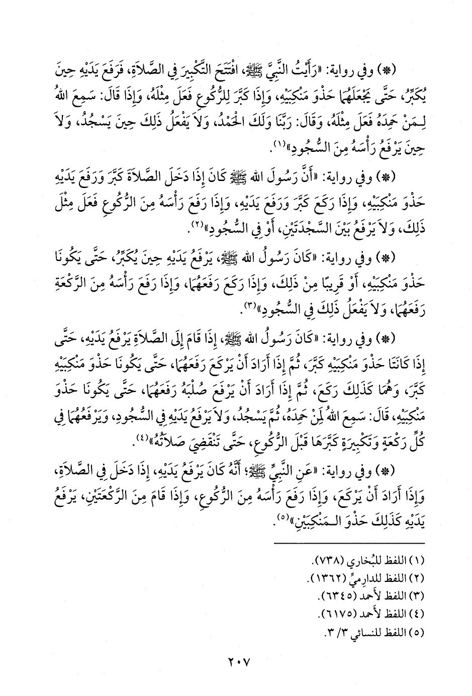 - وفي رواية: «عن سالم، قال: كان ابن عمر إِذا قام إِلى الصلاة، رفع يديه حتى يكونا حذو منكبيه، وإِذا ركع رفعهما، فإِذا رفع رأسه من الركعة رفعهما، وإِذا قام من مثنى رفعهما، ولا يفعل ذلك في السجود، قال: ثم يخبرهم، أَن رسول الله صَلى الله عَليه وسَلم كان يفعله».