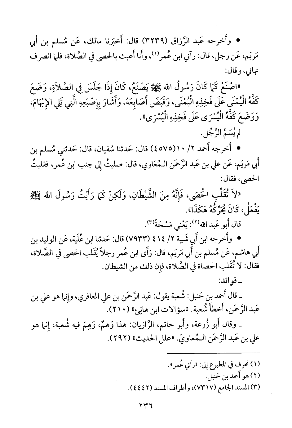 • وأخرجه عبد الرزاق (٣٢٣٩) قال: أخبرنا مالك، عن مسلم بن أبي مريم، عن رجل، قال: رآني ابن عمر (¬١)، وأنا أعبث بالحصى في الصلاة، فلما انصرف نهاني، وقال: