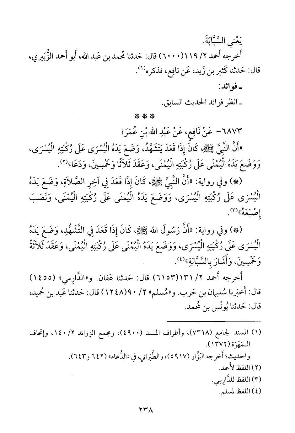 - وفي رواية: «أن رسول الله صَلى الله عَليه وسَلم كان إذا قعد في التشهد، وضع يده اليسرى على ركبته اليسرى، ووضع يده اليمنى على ركبته اليمنى، وعقد ثلاثة وخمسين، وأشار بالسبابة» (¬٣).