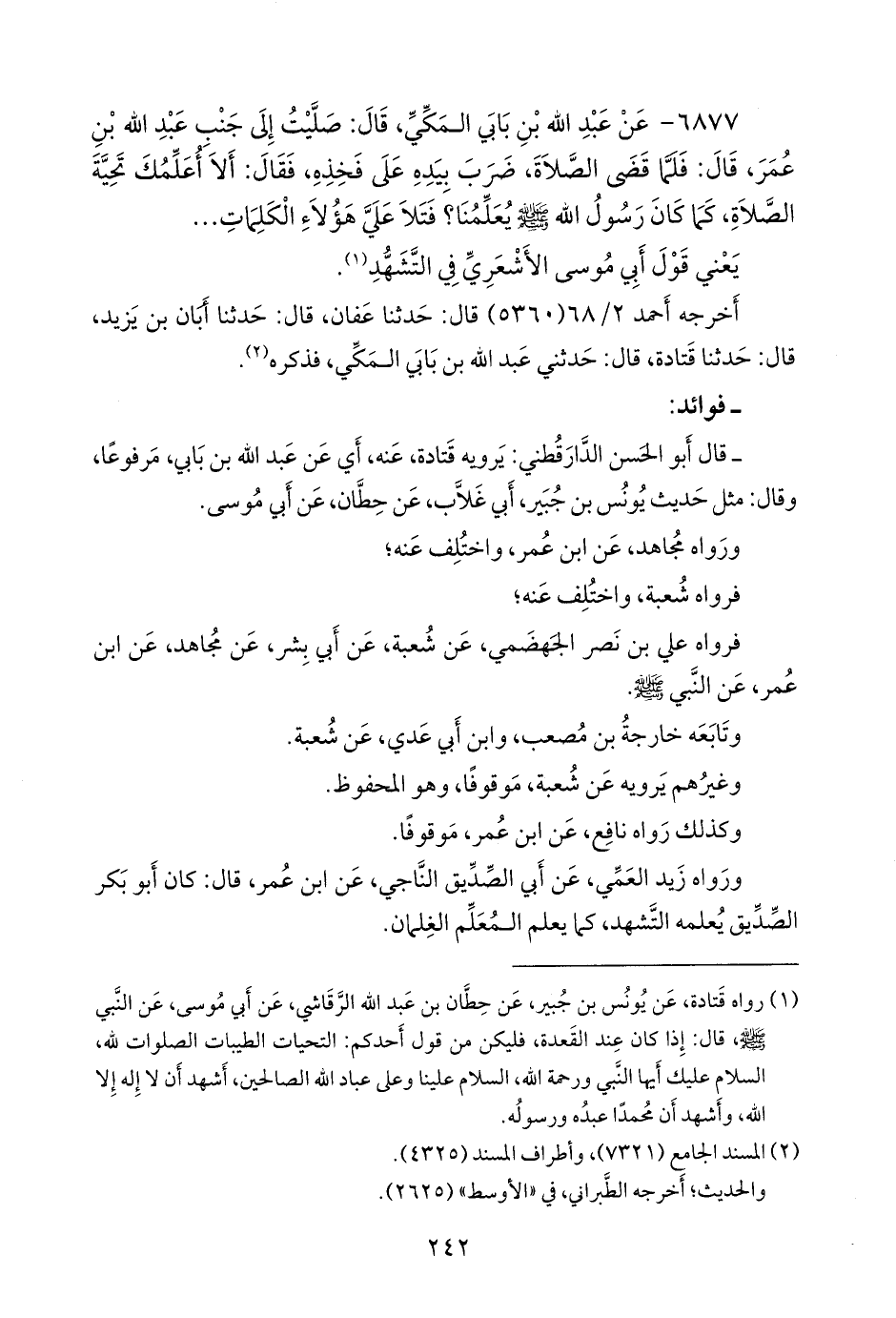 ٦٨٧٧ - عن عبد الله بن بابي المكي، قال: صليت إلى جنب عبد الله بن عمر، قال: فلما قضى الصلاة، ضرب بيده على فخذه، فقال: ألا أعلمك تحية الصلاة، كما كان رسول الله صَلى الله عَليه وسَلم يعلمنا؟ فتلا علي هؤلاء الكلمات.