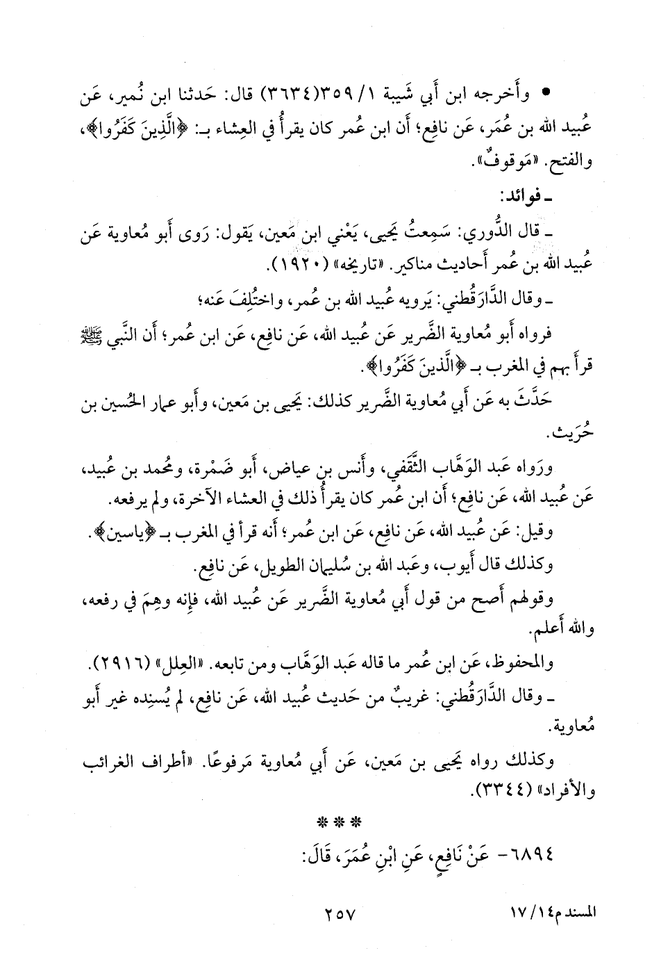 - وقال الدارقُطني: غريبٌ من حديث عُبيد الله، عن نافع، لم يسنده غير أَبي معاوية.