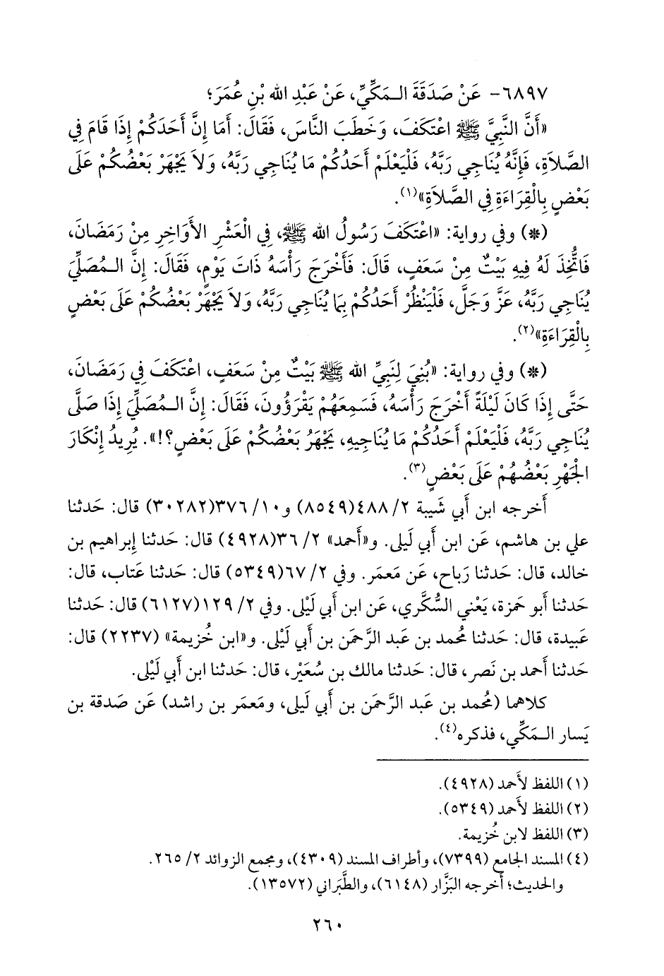 - وفي رواية: «اعتكف رسول الله صَلى الله عَليه وسَلم في العشر الأواخر من رمضان، فاتخذ له فيه بيت من سعف، قال: فأخرج رأسه ذات يوم، فقال: إن المصلي يناجي ربه، عز وجل، فلينظر أحدكم بما يناجي ربه، ولا يجهر بعضكم على بعض بالقراءة» (¬٢).