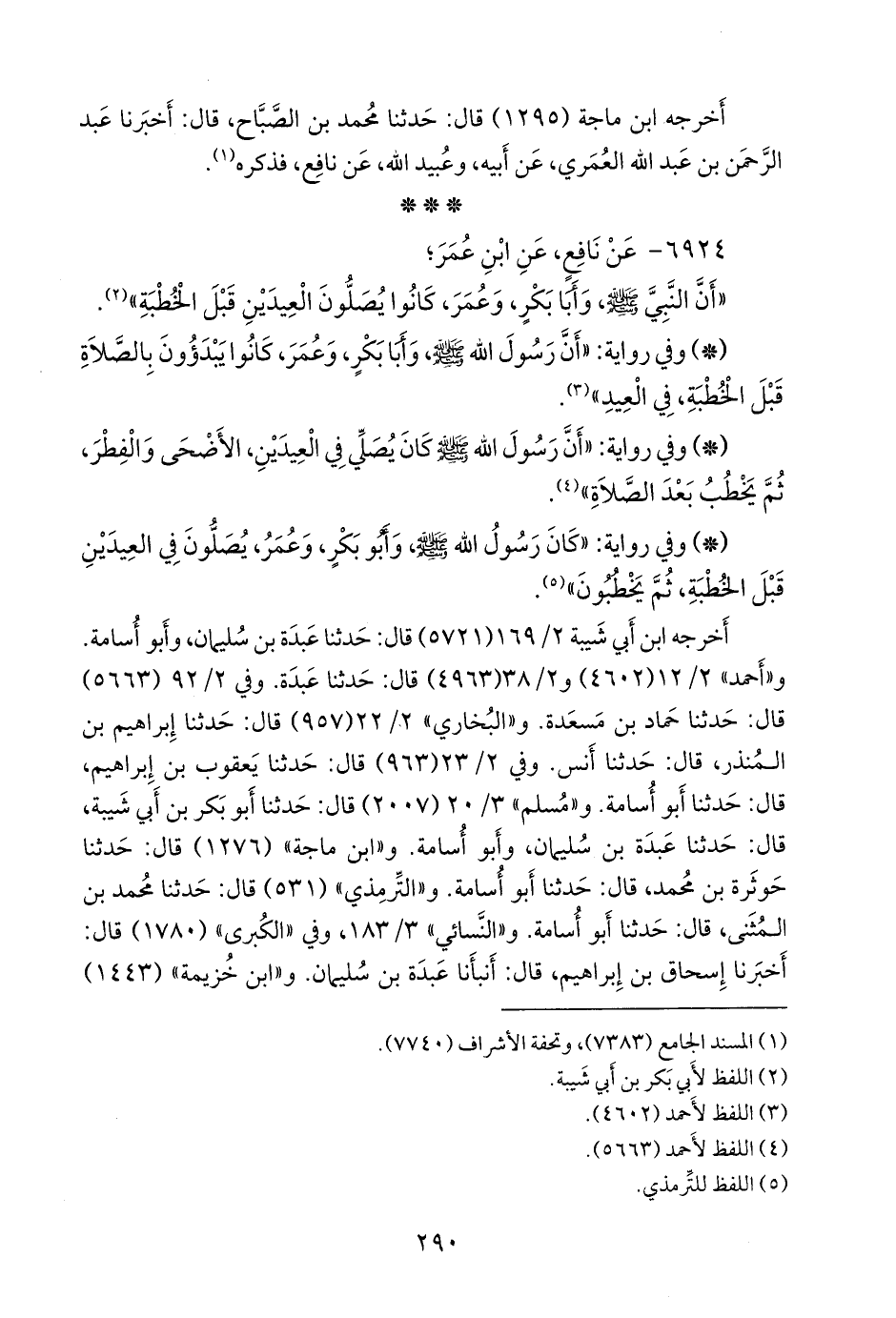 خمستهم (عَبدة بن سليمان، وأَبو أُسامة حماد بن أُسامة، وحماد بن مَسعَدة، وأنس بن عياض، وعبد الوَهَّاب الثقفي) عن عُبيد الله بن عمر، عن نافع، فذكره (¬١).