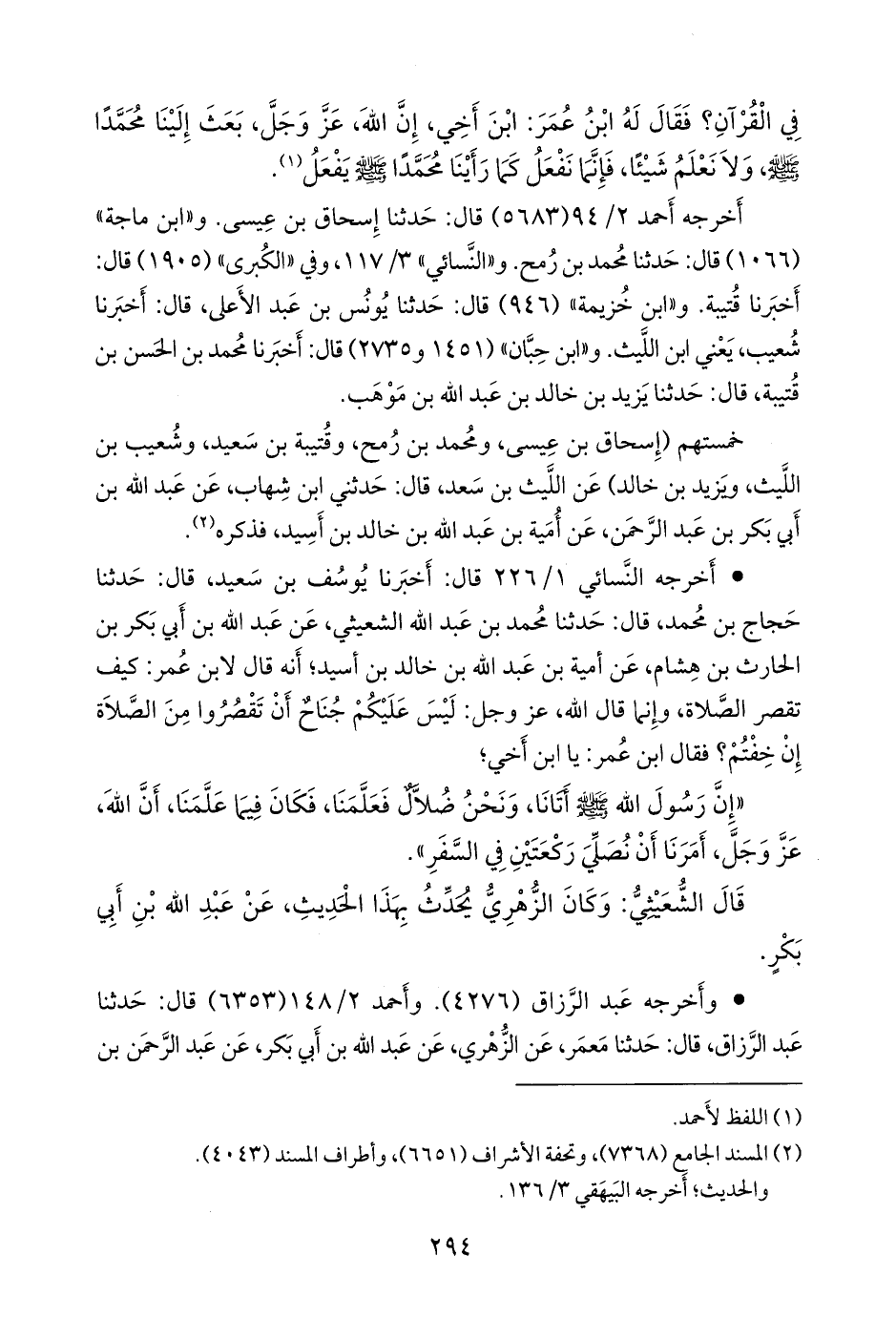 - أَخرجه النَّسَائي ١/ ٢٢٦ قال: أخبرنا يوسف بن سعيد، قال: حدثنا حجاج بن محمد، قال: حدثنا محمد بن عبد الله الشعيثي، عن عبد الله بن أَبي بكر بن الحارث بن هشام، عن أُمَية بن عبد الله بن خالد بن أَسيد؛ أنه قال لابن عمر: كيف تقصر الصلاة، وإنما قال الله، عز وجل: ليس عليكم جناح أن تقصروا من الصلاة إن خفتم؟ فقال ابن عمر: يا ابن أخي؛