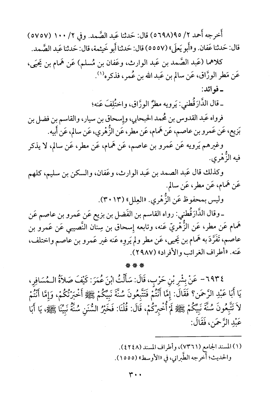 - وقال الدارقُطني: رواه القاسم بن الفضل بن بزيع، عن عَمرو بن عاصم، عن همام، عن مطر، عن الزُّهْري، عنه، وتابعه إسحاق بن سنان النصيبي عن عَمرو بن عاصم، تفرد به همام بن يحيى، عن مطر، ولم يروه عنه غير عَمرو بن عاصم، واختلف عنه. «أطراف الغرائب والأفراد» (٢٩٨٧).