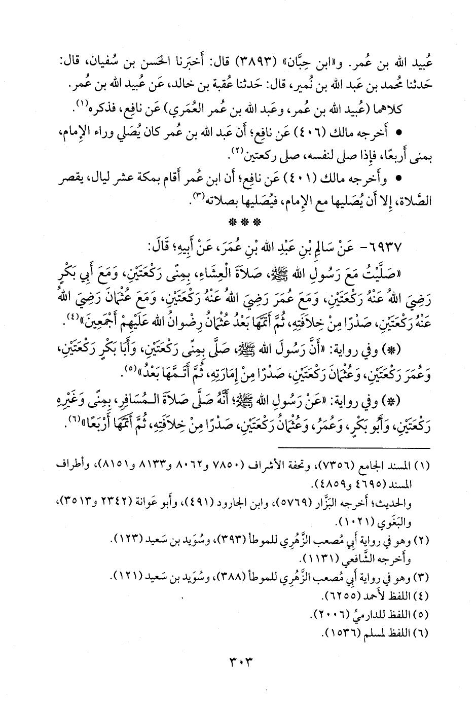 - وفي رواية: «عن رسول الله صَلى الله عَليه وسَلم؛ أنه صلى صلاة المسافر، بمنى وغيره ركعتين، وأَبو بكر، وعمر، وعثمان ركعتين، صدرا من خلافته، ثم أتمها أربعا» (¬٣).