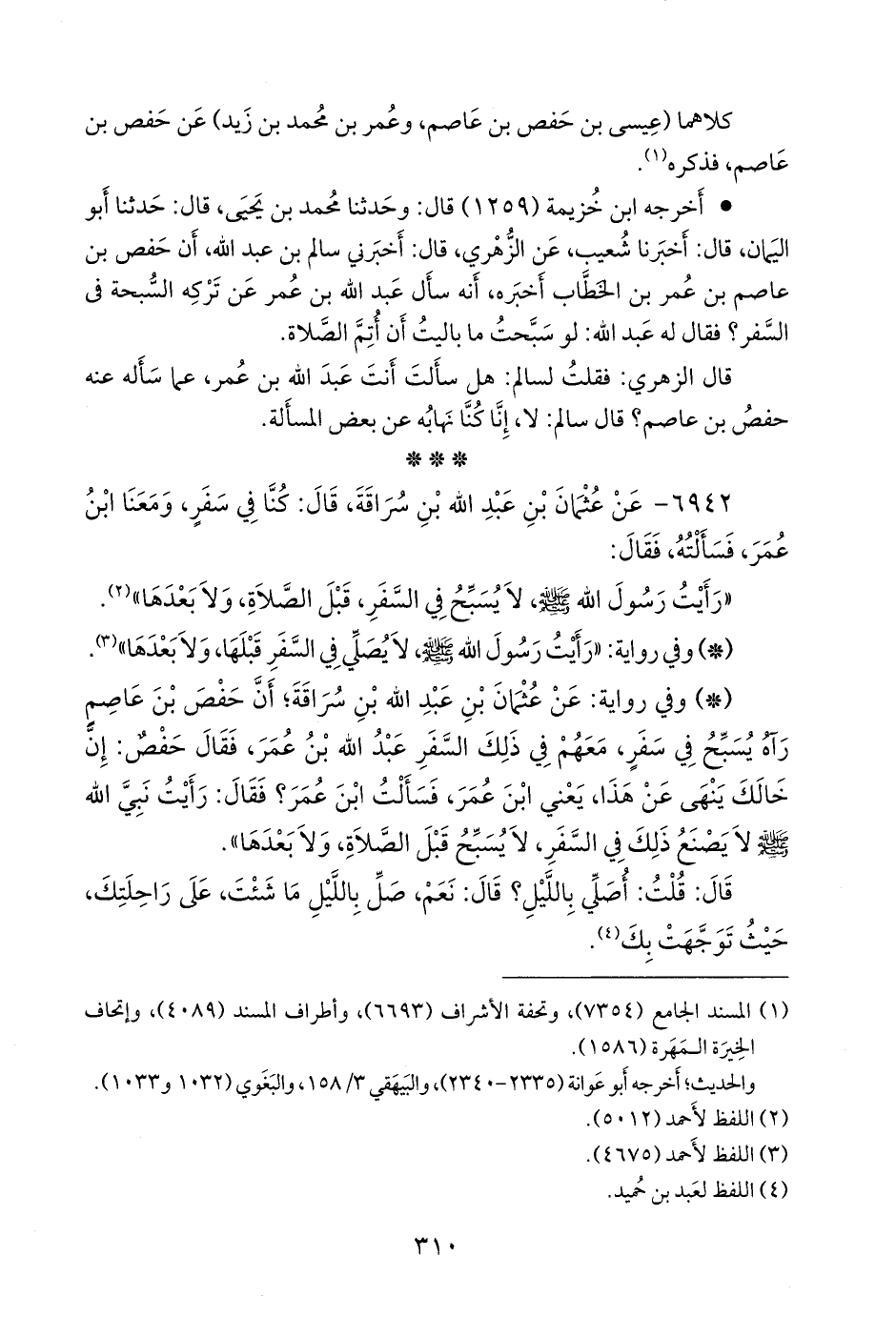 - وفي رواية: «عن عثمان بن عبد الله بن سراقة؛ أن حفص بن عاصم رآه يسبح في سفر، معهم في ذلك السفر عبد الله بن عمر، فقال حفص: إن خالك ينهى عن هذا، يعني ابن عمر، فسألت ابن عمر؟ فقال: رأيت نبي الله صَلى الله عَليه وسَلم لا يصنع ذلك في السفر، لا يسبح قبل الصلاة، ولا بعدها».