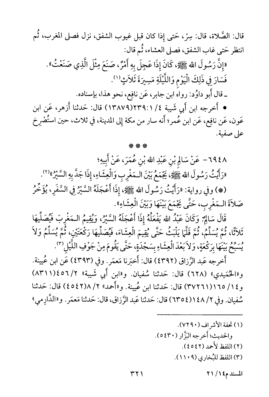 قال سالم: وكان عبد الله يفعله إذا أعجله السير، ويقيم المغرب فيصليها ثلاثا، ثم يسلم، ثم قلما يلبث حتى يقيم العشاء، فيصليها ركعتين، ثم يسلم ولا يسبح بينها بركعة، ولا بعد العشاء بسجدة، حتى يقوم من جوف الليل (¬٢).