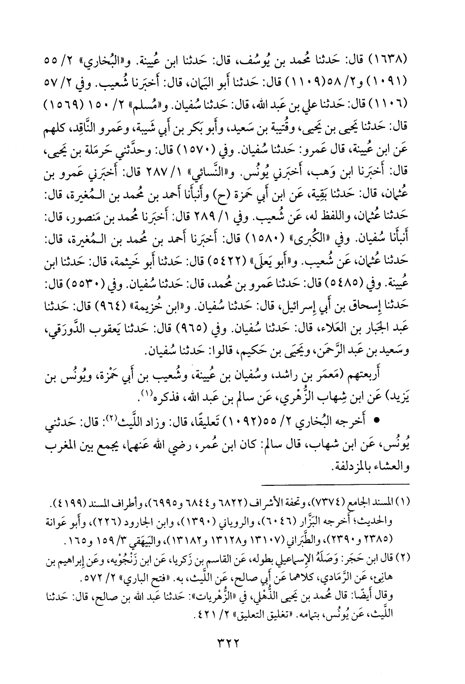 وفي (١٥٧٠) قال: وحدثني حَرملة بن يحيى، قال: أخبرنا ابن وهب، قال: أخبرني يونس. و «النَّسَائي» ١/ ٢٨٧ قال: أخبرني عَمرو بن عثمان، قال: حدثنا بقية، عن ابن أبي حمزة (ح) وأنبأنا أحمد بن محمد بن المغيرة، قال: حدثنا عثمان، واللفظ له, عن شعيب. وفي ١/ ٢٨٩ قال: أخبرنا محمد بن منصور، قال: أنبأنا سفيان. وفي «الكبرى» (١٥٨٠) قال: أخبرنا أحمد بن محمد بن المغيرة، قال: حدثنا عثمان، عن شعيب. و «أَبو يَعلى» (٥٤٢٢) قال: حدثنا أَبو خيثمة، قال: حدثنا ابن عُيينة. وفي (٥٤٨٥) قال: حدثنا عَمرو بن محمد، قال: حدثنا سفيان. وفي (٥٥٣٠) قال: حدثنا إسحاق بن أبي إسرائيل، قال: حدثنا سفيان. و «ابن خزيمة» (٩٦٤) قال: حدثنا عبد الجبار بن العلاء، قال: حدثنا سفيان. وفي (٩٦٥) قال: حدثنا يعقوب الدورقي، وسعيد بن عبد الرَّحمَن، ويحيى بن حكيم، قالوا: حدثنا سفيان.
