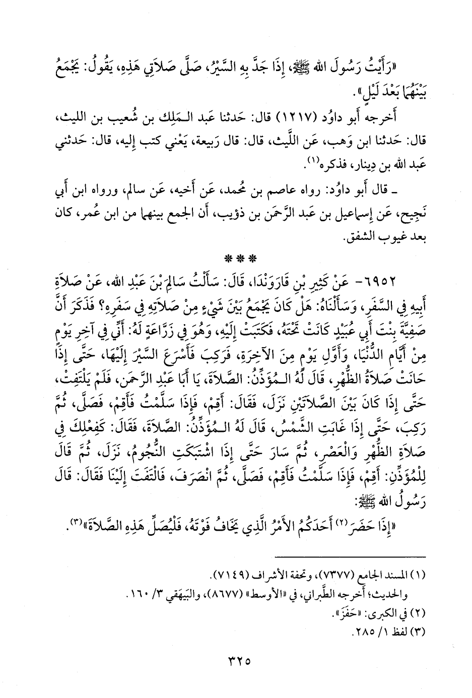 ٦٩٥٢ - عن كثير بن قاروندا، قال: سألت سالم بن عبد الله، عن صلاة أبيه في السفر، وسألناه: هل كان يجمع بين شيء من صلاته في سفره؟ فذكر أن صفية بنت أبي عبيد كانت تحته، فكتبت إليه، وهو في زراعة له: أني في آخر يوم من أيام الدنيا، وأول يوم من الآخرة، فركب فأسرع السير إليها، حتى إذا حانت صلاة الظهر، قال له المؤذن: الصلاة، يا أبا عبد الرَّحمَن، فلم يلتفت، حتى إذا كان بين الصلاتين نزل، فقال: أقم، فإذا سلمت فأقم، فصلى، ثم ركب، حتى إذا غابت الشمس، قال له المؤذن: الصلاة، فقال: كفعلك في صلاة الظهر والعصر، ثم سار حتى إذا اشتبكت النجوم، نزل، ثم قال للمؤذن: أقم، فإذا سلمت فأقم، فصلى، ثم انصرف، فالتفت إلينا فقال: قال رسول الله صَلى الله عَليه وسَلم: