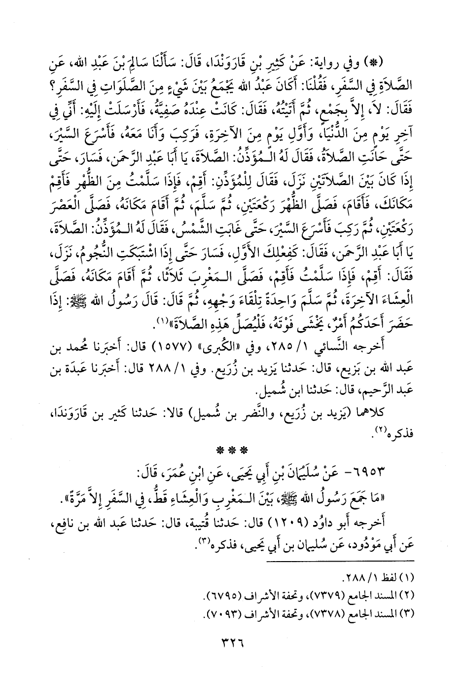- وفي رواية: عن كثير بن قاروندا، قال: سألنا سالم بن عبد الله، عن الصلاة في السفر، فقلنا: أكان عبد الله يجمع بين شيء من الصلوات في السفر؟ فقال: لا، إلا بجمع، ثم أتيته، فقال: كانت عنده صفية، فأرسلت إليه: أني في آخر يوم من الدنيا، وأول يوم من الآخرة، فركب وأنا معه، فأسرع السير، حتى حانت الصلاة، فقال له المؤذن: الصلاة، يا أبا عبد الرَّحمَن، فسار، حتى إذا كان بين الصلاتين نزل، فقال للمؤذن: أقم، فإذا سلمت من الظهر فأقم مكانك، فأقام، فصلى الظهر ركعتين، ثم سلم، ثم أقام مكانه، فصلى العصر ركعتين، ثم ركب فأسرع السير، حتى غابت الشمس، فقال له المؤذن: الصلاة، يا أبا عبد الرَّحمَن، فقال: كفعلك الأول، فسار حتى إذا اشتبكت النجوم، نزل، فقال: أقم، فإذا سلمت فأقم، فصلى المغرب ثلاثا، ثم أقام مكانه، فصلى العشاء الآخرة، ثم سلم واحدة تلقاء وجهه، ثم قال: قال رسول الله صَلى الله عَليه وسَلم: إذا حضر أحدكم أمر، يخشى فوته، فليصل هذه الصلاة» (¬١).