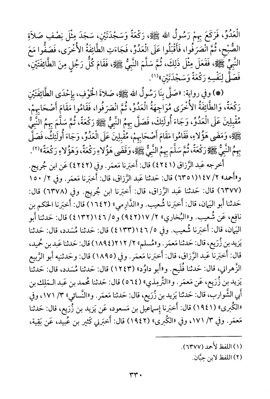 - وفي رواية: «صلى بنا رسول الله صَلى الله عَليه وسَلم صلاة الخوف، بإحدى الطائفتين ركعة، والطائفة الأخرى مواجهة العدو، ثم انصرفوا، فقاموا مقام أصحابهم، مقبلين على العدو، وجاء أولئك، فصلى بهم النبي صَلى الله عَليه وسَلم ركعة، ثم سلم بهم النبي صَلى الله عَليه وسَلم ومضى هؤلاء، فقاموا مقام أصحابهم، مقبلين على العدو، وجاء أولئك، فصلى بهم النبي صَلى الله عَليه وسَلم ركعة، ثم سلم بهم النبي صَلى الله عَليه وسَلم وقضى هؤلاء ركعة، وهؤلاء ركعة» (¬١).