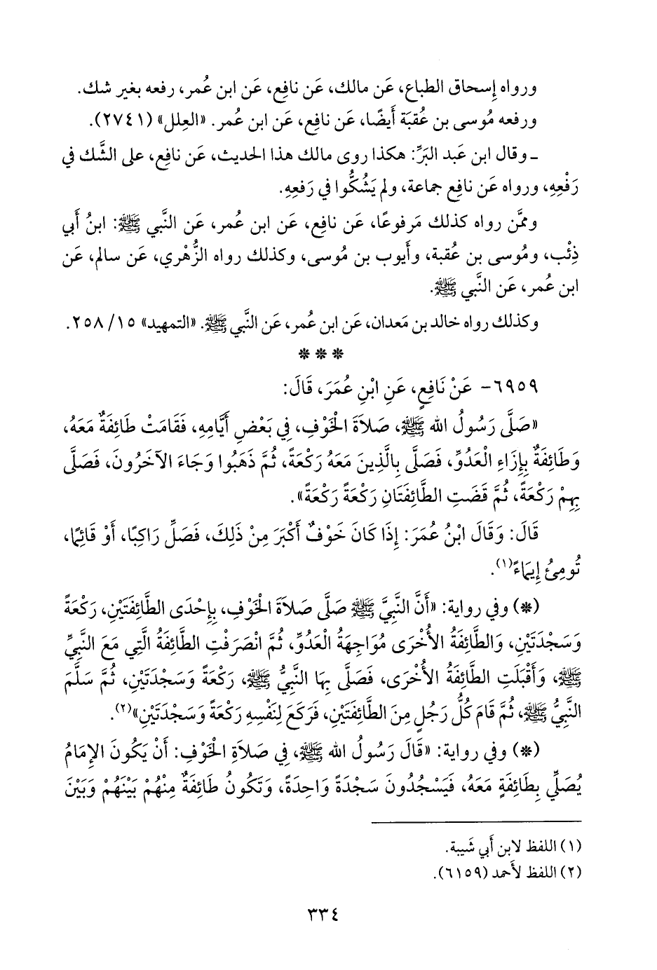 - وفي رواية: «قال رسول الله صَلى الله عَليه وسَلم في صلاة الخوف: أن يكون الإمام يصلي بطائفة معه، فيسجدون سجدة واحدة، وتكون طائفة منهم بينهم وبين