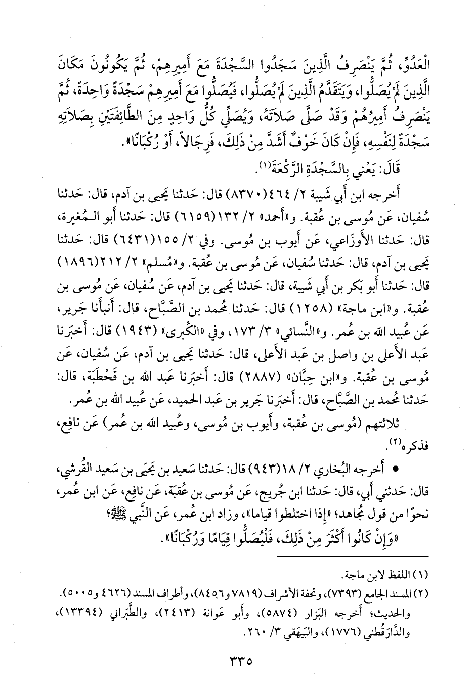 (¬١) أخرجه الدارقُطني «العلل» (٢٧٤١) قال: حدثنا عبد الله بن محمد بن سعيد الجمال المُقرِئ، قال: حدثنا علي بن عَمرو الأَنصاري، قال: حدثنا يحيى بن سعيد الأُمَوي، عن ابن جُريج، عن موسى بن عُقبة، عن نافع، عن ابن عمر، نحوا من قول مجاهد؛ إذا اختلطوا، فإنما هو الذكر، وإشارة بالرؤوس، وزادني ابن عمر، عن النبي صَلى الله عَليه وسَلم؛ فإن كانوا أكثر من ذلك، فليصلوا قياما وركبانا.