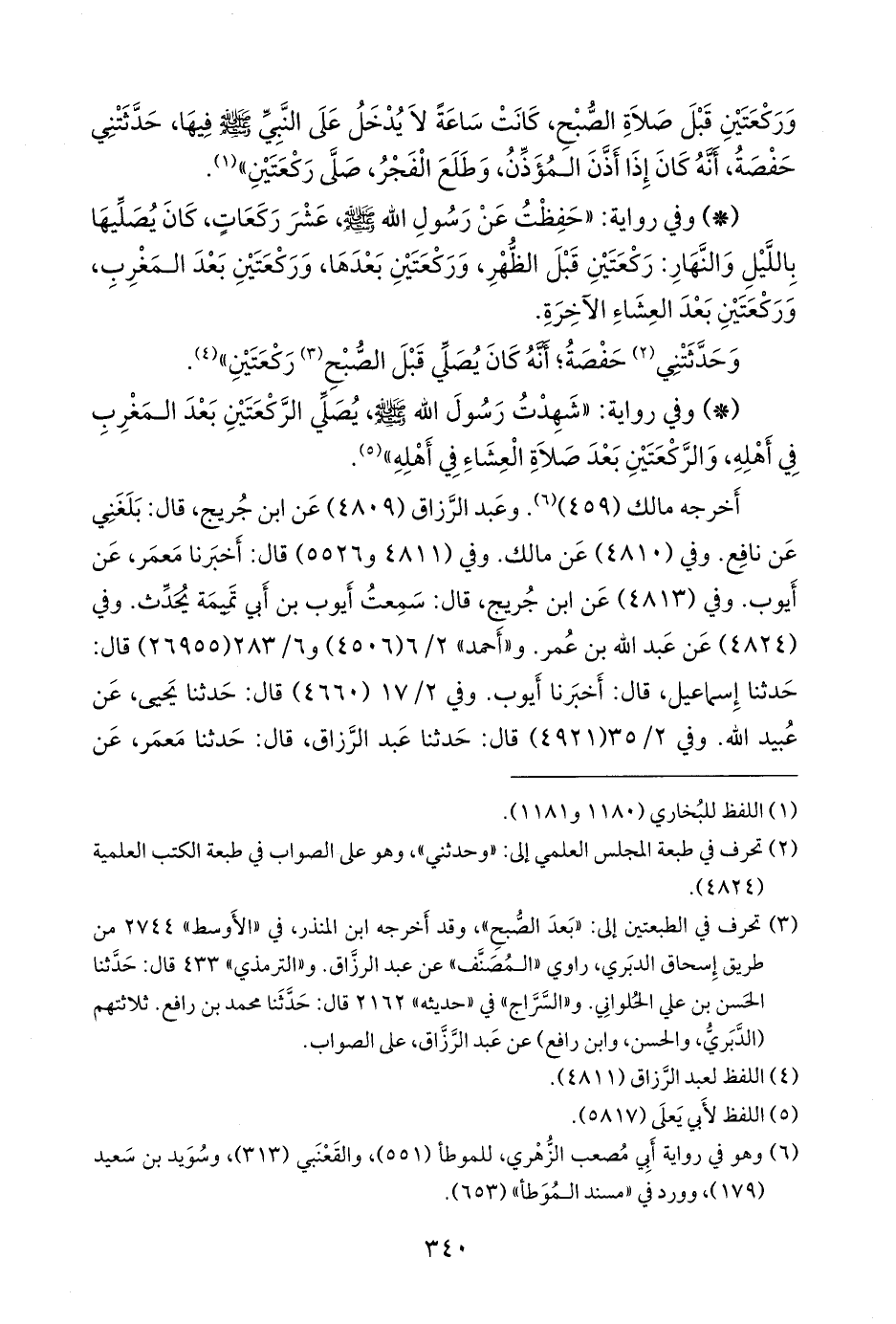 - وفي رواية: «شهدت رسول الله صَلى الله عَليه وسَلم يصلي الركعتين بعد المغرب في أهله، والركعتين بعد صلاة العشاء في أهله» (¬٢).