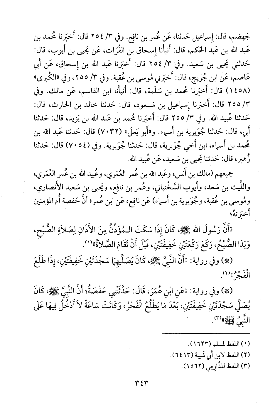 - وفي رواية: «عن ابن عمر، قال: حدثتني حفصة؛ أن النبي صَلى الله عَليه وسَلم كان يصلي سجدتين خفيفتين، بعد ما يطلع الفجر، وكانت ساعة لا أدخل فيها على النبي صَلى الله عَليه وسَلم» (¬٢).