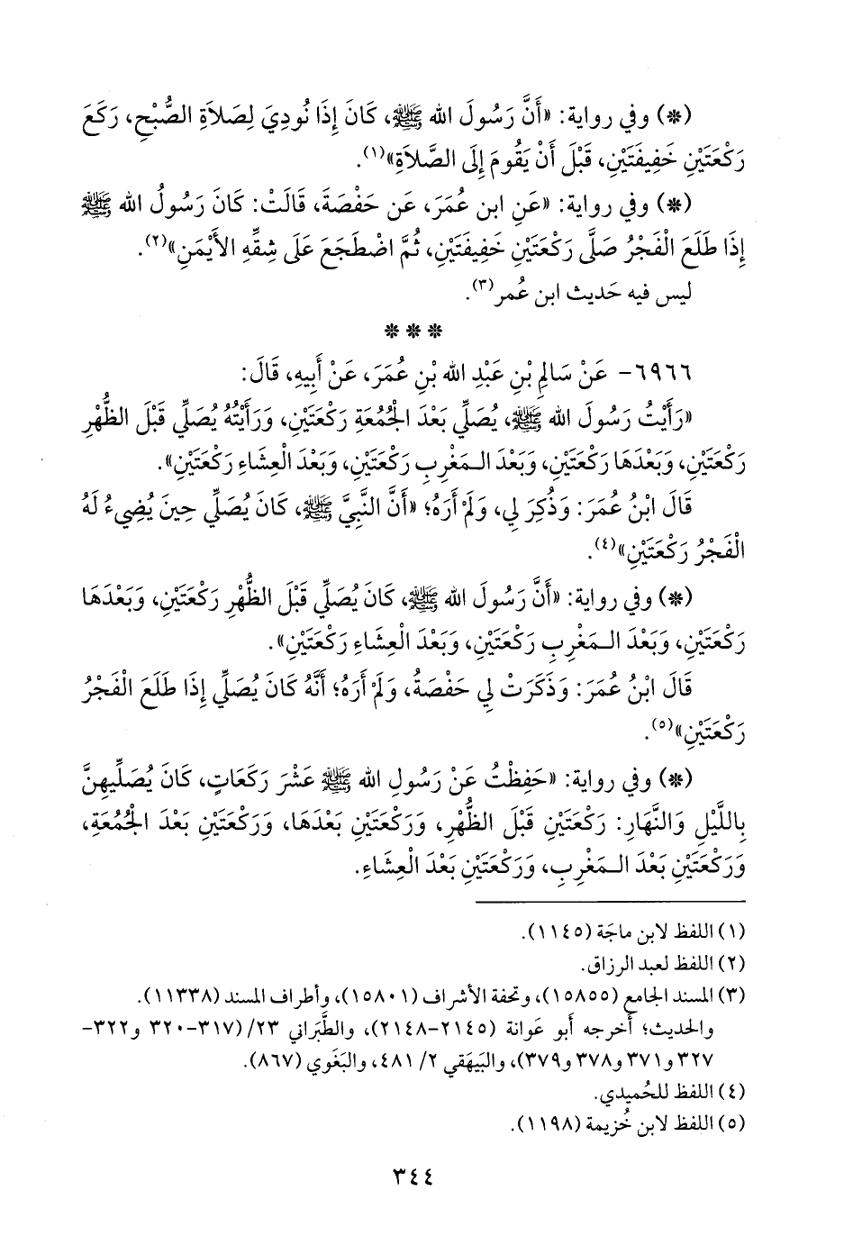 - وفي رواية: «عن ابن عمر؛ أن رسول الله صَلى الله عَليه وسَلم كان إذا أضاء الفجر، صلى ركعتين» (¬٥).