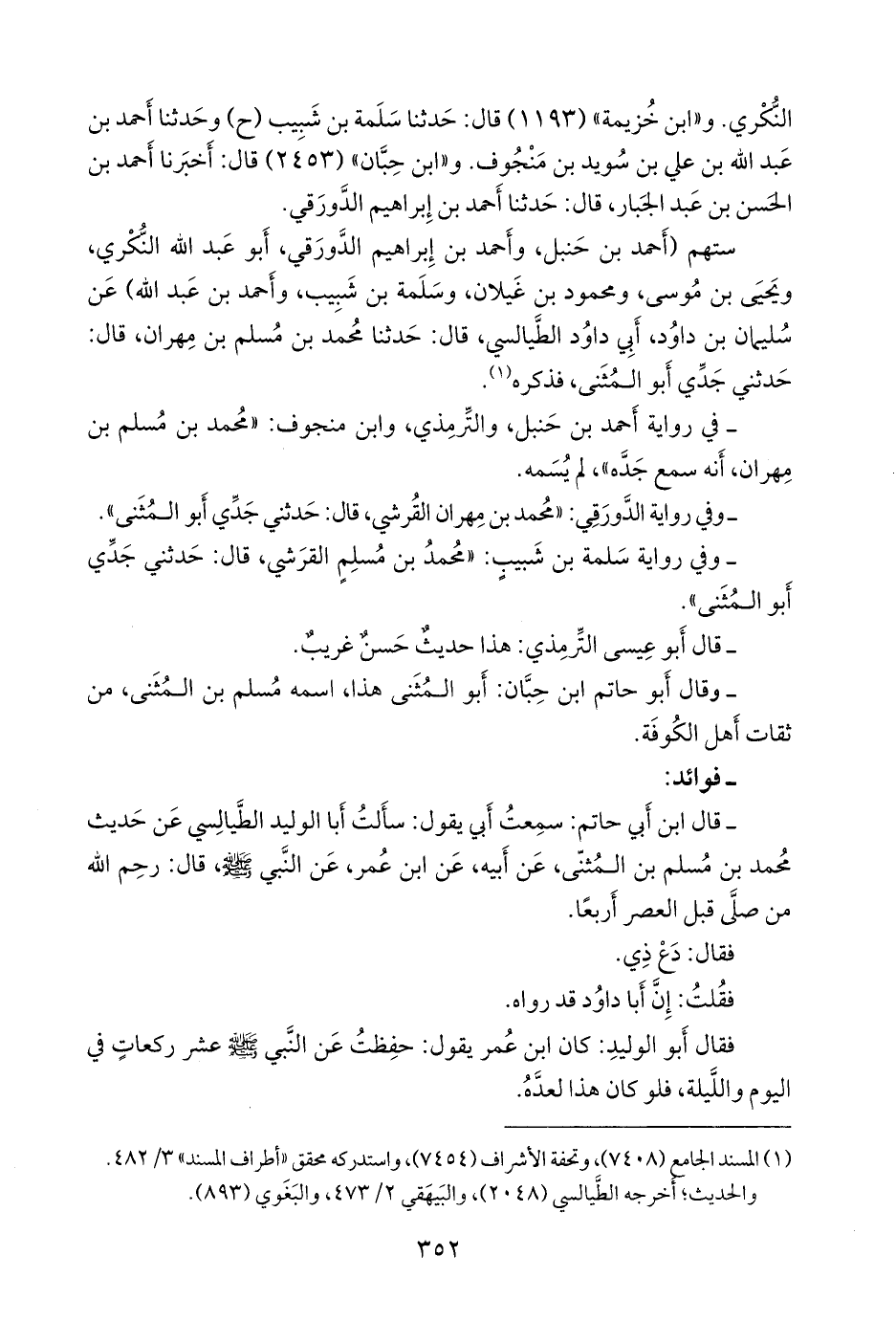 - قال عبد الرَّحمَن بن أبي حاتم الرازي: سمعت أبي يقول: سألتُ أَبا الوليد الطيالسي عن حديث محمد بن مسلم بن المثنى، عن أبيه، عن ابن عمر، عن النبي صَلى الله عَليه وسَلم قال: رحم الله من صلى قبل العصر أربعا، فقال: دع ذي، فقلت: إن أبا داود قد رواه، فقال أَبو الوليد: كان ابن عمر يقول: حفظت عن النبي صَلى الله عَليه وسَلم عشر ركعات في اليوم والليلة، فلو كان هذا لعده.