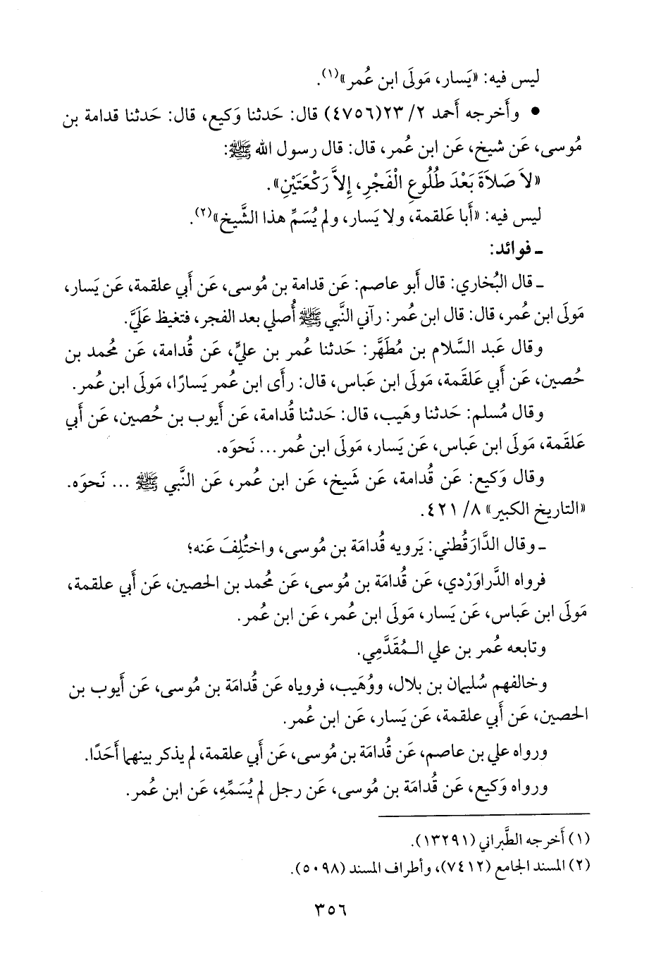 - قال البخاري: قال أَبو عاصم: عن قدامة بن موسى، عن أبي علقمة، عن يسار مولى ابن عمر، قال: قال ابن عمر: رآني النبي صَلى الله عَليه وسَلم أصلي بعد الفجر، فتغيظ علي.