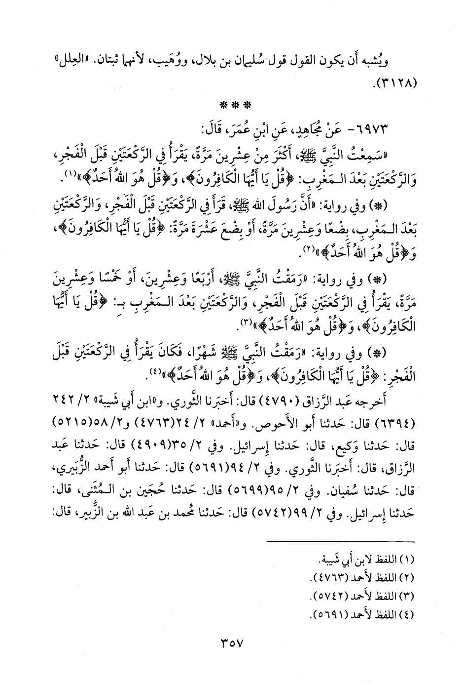 - وفي رواية: «رمقت النبي صَلى الله عَليه وسَلم أربعا وعشرين، أو خمسا وعشرين مرة، يقرأ في الركعتين قبل الفجر، والركعتين بعد المغرب ب: {قُلْ يَا أَيُّهَا الْكَافِرُونَ}، و {قُلْ هُوَ اللهُ أَحَدٌ}» (¬٣).