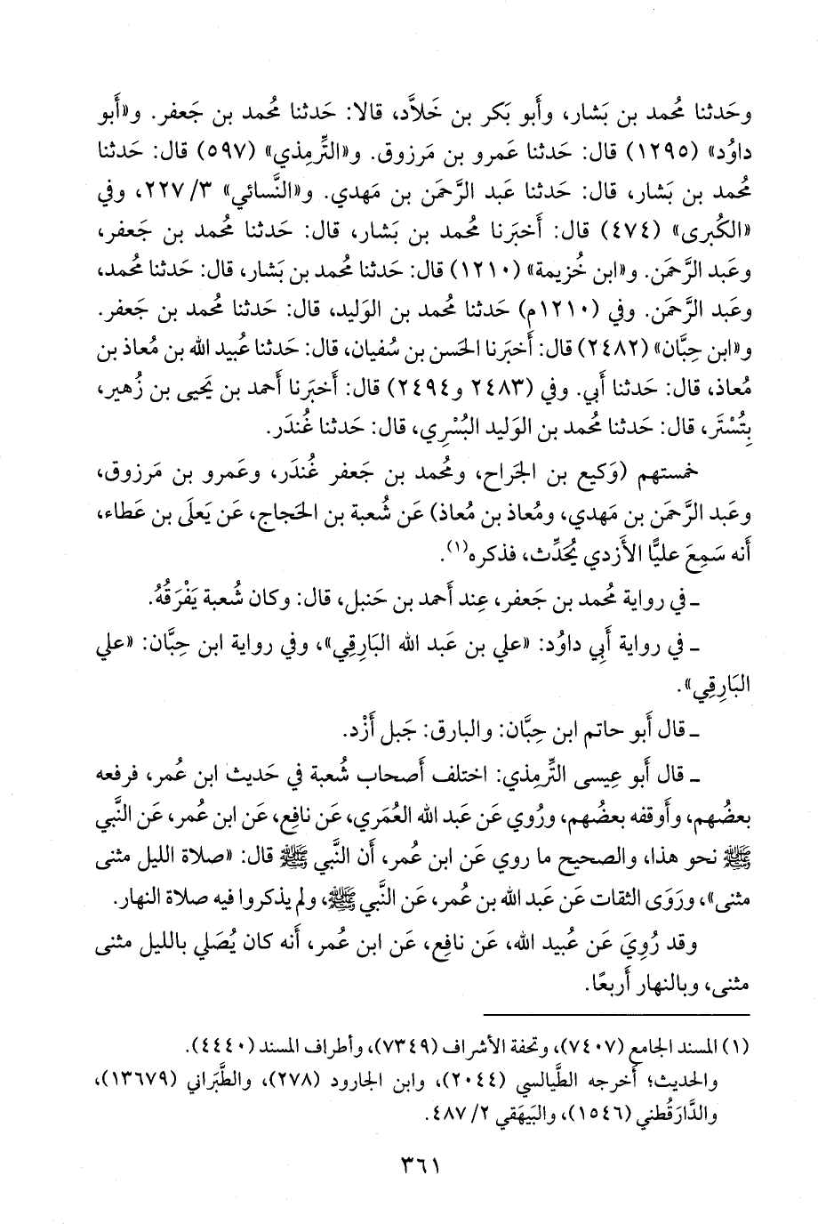 - قال التِّرمِذي: اختلف أصحاب شعبة في حديث ابن عمر، فرفعه بعضهم، وأوقفه بعضهم، وروي عن عبد الله العمري، عن نافع، عن ابن عمر، عن النبي صَلى الله عَليه وسَلم نحو هذا، والصحيح ما روي عن ابن عمر، أن النبي صَلى الله عَليه وسَلم قال: «صلاة الليل مثنى مثنى»، وروى الثقات عن عبد الله بن عمر، عن النبي صَلى الله عَليه وسَلم ولم يذكروا فيه صلاة النهار.