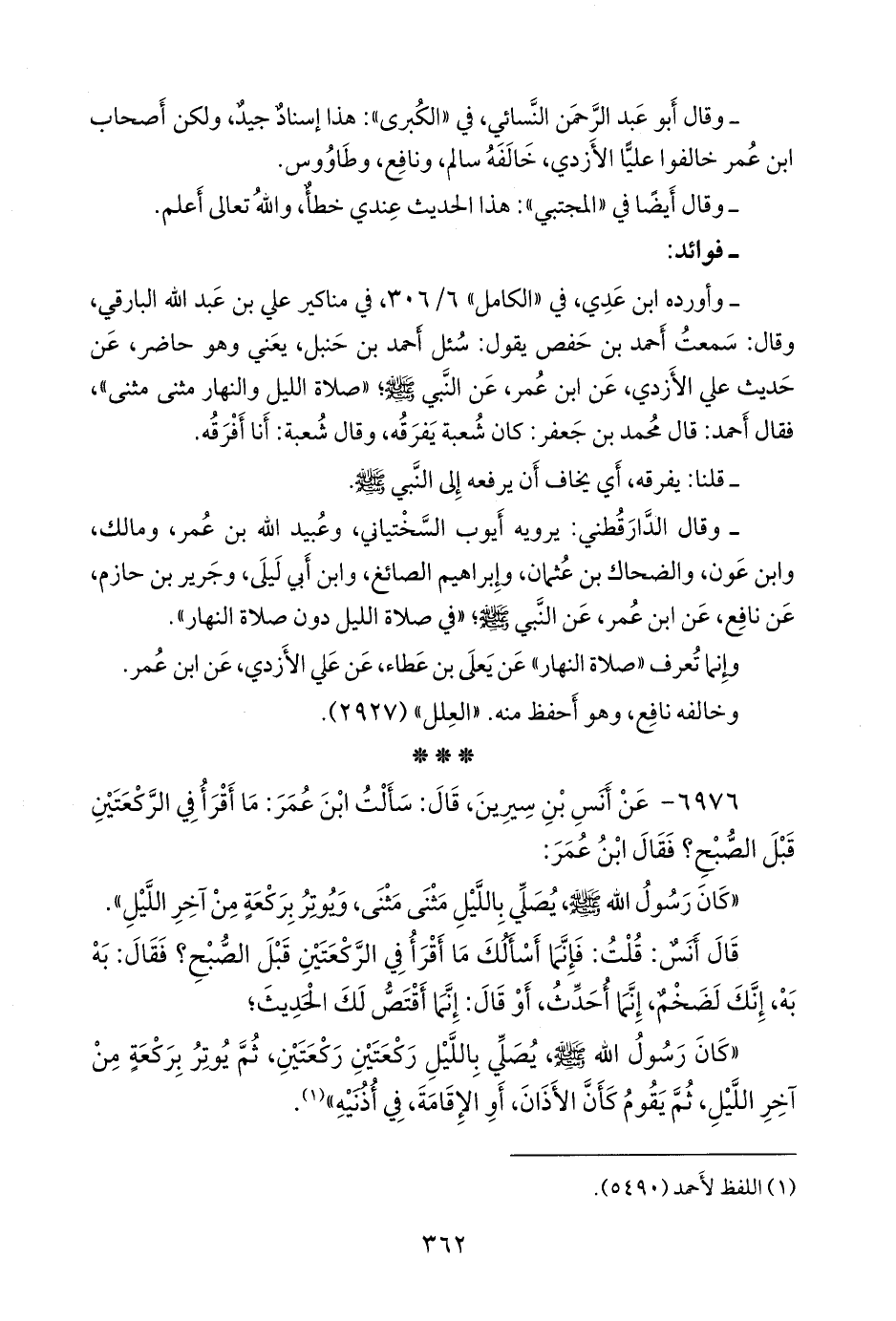- وقال الدارقُطني: يرويه أيوب السَّخْتِياني، وعُبيد الله بن عمر، ومالك، وابن عون، والضحاك بن عثمان، وإبراهيم الصائغ، وابن أبي ليلى، وجرير بن حازم، عن نافع، عن ابن عمر، عن النبي صَلى الله عَليه وسَلم؛ «في صلاة الليل دون صلاة النهار».