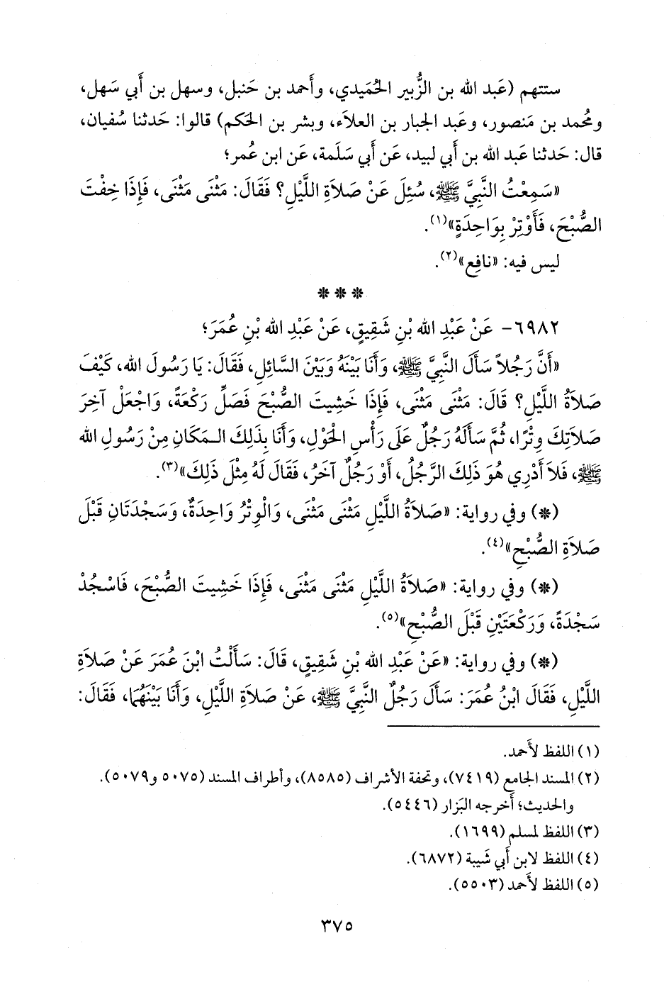 - وفي رواية: «عن عبد الله بن شقيق، قال: سألت ابن عمر عن صلاة الليل، فقال ابن عمر: سأل رجل النبي صَلى الله عَليه وسَلم عن صلاة الليل، وأنا بينهما، فقال: