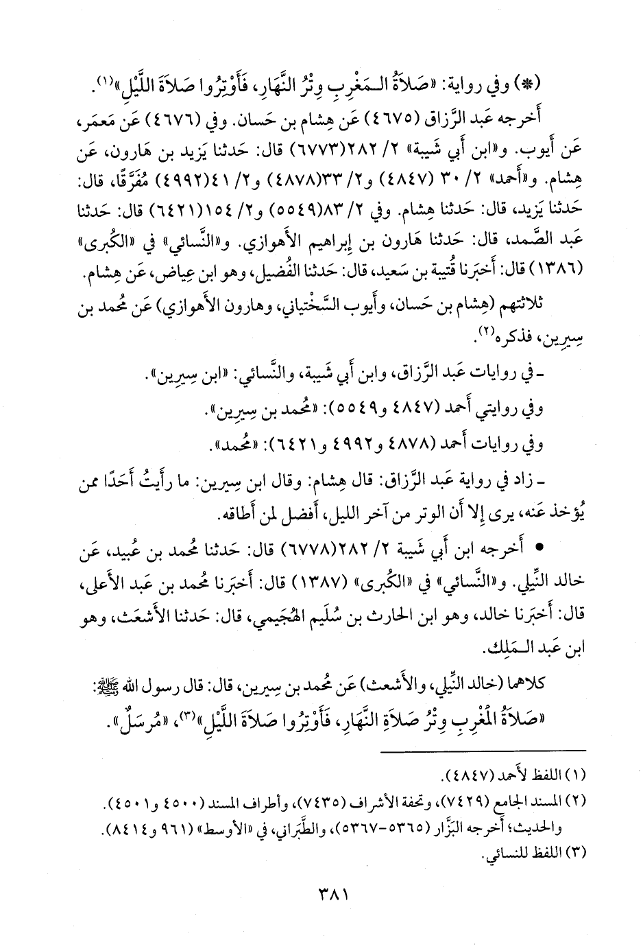 - زاد في رواية عبد الرزاق: قال هشام: وقال ابن سِيرين: ما رأيت أحدا ممن يؤخذ عنه، يرى إلا أن الوتر من آخر الليل، أفضل لمن أطاقه.