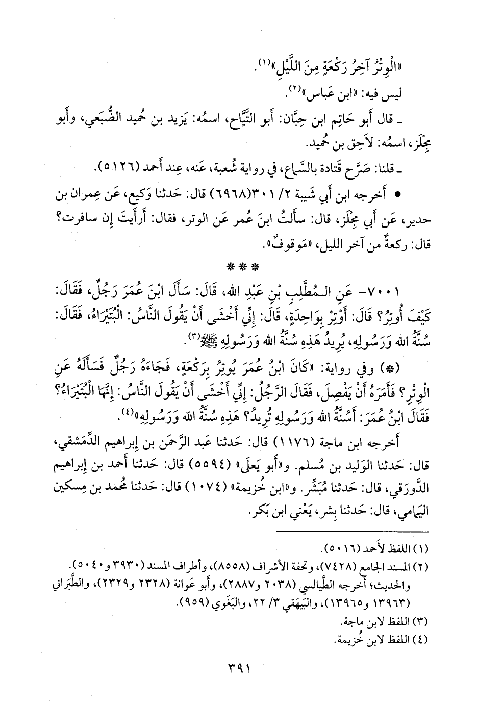 ٧٠٠١ - عن المطلب بن عبد الله، قال: سأل ابن عمر رجل، فقال: كيف أوتر؟ قال: أوتر بواحدة، قال: إني أخشى أن يقول الناس: البتيراء، فقال: سنة الله ورسوله، يريد هذه سنة الله ورسوله صَلى الله عَليه وسَلم (¬١).