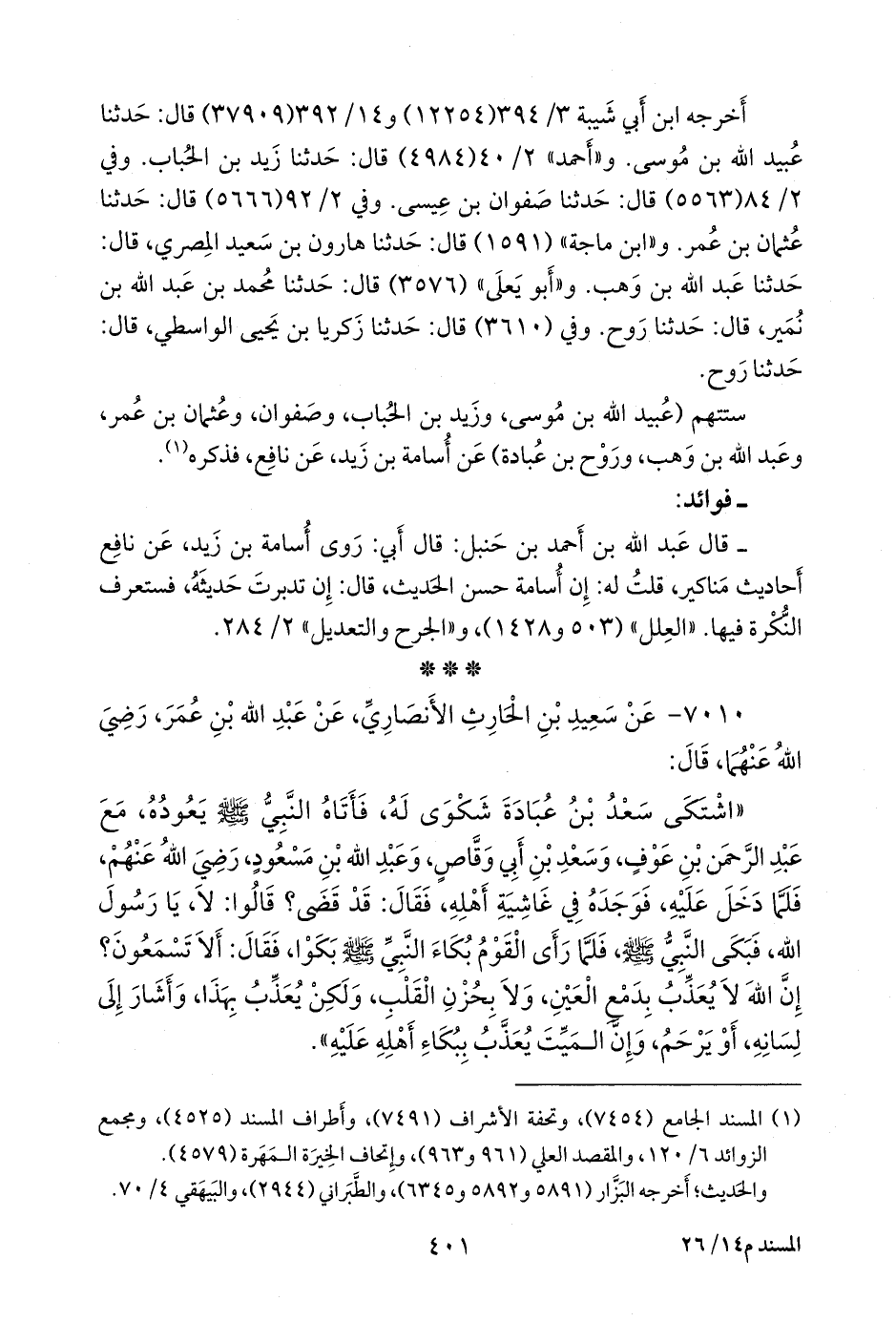 ستتهم (عُبيد الله بن موسى، وزيد بن الحُبَاب، وصفوان، وعثمان بن عمر، وعبد الله بن وهب، وروح بن عبادة) عن أُسامة بن زيد، عن نافع، فذكره (¬١).